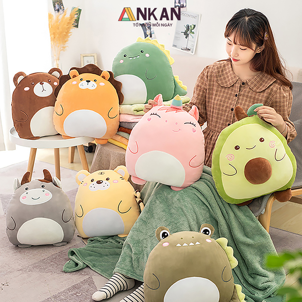 Bộ Chăn Gối Văn Phòng Đa Năng Hình Thú Gấu Bông Dễ Thương, Tiện Lợi Cho Bé Đi Học Và Du Lịch CHĂN GỐI VĂN PHÒNG ANKAN CÓ GÌ ĐẶC BIỆT Thiết kế hình thú xinh xắn, phù hợp làm quà sinh nhật, quà tặng bạn bè, người yêu, đồng nghiệp. Đa năng 3 trong 1: vừa là gối ôm – gối tựa lưng – gối luồn tay, kèm chăn êm giữ ấm. Sử dụng tiện lợi cho nhiều mục đích: ngủ trưa văn phòng, đi học, đi làm, du lịch. Trên sản phẩm có nhãn chữ “はい” (hai) – nghĩa là “Vâng” trong tiếng Việt, mang đến cảm giác dễ thương, tích cực và gần gũi theo phong cách Nhật Bản. CAM KẾT TỪ ANKAN Sản phẩm đúng mô tả, đúng mẫu, đúng kích thước. Đổi trả trong 15 ngày nếu khách không hài lòng. Hoàn tiền 100% nếu sản phẩm lỗi do nhà sản xuất. Đóng gói sạch sẽ, an toàn, giao hàng nhanh chóng. THÔNG SỐ KỸ THUẬT Kích thước gối: 40 x 35 cm. Kích thước chăn: 100 x 170 cm (được lồng gọn trong gối). Chất liệu vỏ: vải nhung siêu mềm. Chất liệu ruột: bông PP cao cấp, an toàn cho da. Trọng lượng: khoảng 800g. Có 4 kiểu dáng để bạn lựa chọn là Cáo Đỏ, Cá Voi Xanh, Cừu Trắng và Gấu Nhật Bản ƯU ĐIỂM NỔI BẬT Vải nhung mềm mịn, thoáng khí, dễ giặt sạch.