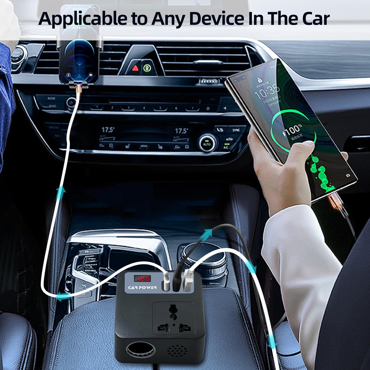 Bộ Chuyển Đổi Điện,Biến Tần Đa Năng 12V/24V Sang 110V/220V Cho Xe hơi, Ô tô. 1 Cổng Type C - 2 cổng USB có sạc nhanh QC3.0, Châm Lửa,.. Thông tin sản phẩm Kich cỡ: 884cm Cân nặng: 163g Chất liệu: ABS Công suất định mức: 100W Công suất cực đại: 150W Điện áp đầu vào: DC12-24V Or DC12V Điện áp đầu ra: 110V-220V Or 220V Dành cho xe ô tô/xe tải nhỏ thông dụng 12V/24V đến DC 110V/220V.  Không sử dụng để cung cấp năng lượng cho các thiết bị điện công suất cao, chẳng hạn như thiết bị nấu ăn, máy sấy tóc, lò sưởi điện vì chúng có thể làm nổ cầu chì Vật liệu chống cháy, màn hình giám sát thông minh điện áp LCD, hỗ trợ sạc nhanh Dùng để sạc máy tính xách tay, máy tính bảng, điện thoại di động, quà tặng giáng sinh, máy hút sữa, máy phun sương, máy chơi game, Kindle, TV, đầu DVD, đèn và các thiết bị điện tử khác.  Bảo vệ & làm mát thông minh: Tích hợp nhiều hệ thống bảo vệ, bao gồm ngắn mạch, điện áp thấp, quá tải, quá điện áp, v. v. Hệ thống làm mát thông minh cho phép biến tần điện của xe tản nhiệt nhiều lần để kéo dài tuổi thọ. Bảo hành: 1 tháng