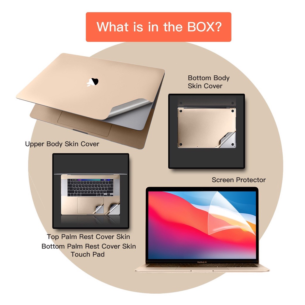 + Miếng dán chống xước, phủ lớp kim loại tản nhiệt tốt cho Macbook + Miếng dán bao quanh bàn phím máy và gồm 1 miếng dán phần di chuột trackpad + Màu cơ bản