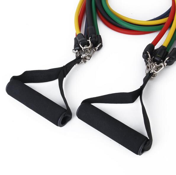 Bộ dây đàn hồi tập thể lực có 5 dây, mỗi dây có mức trọng lượng khác nhau, từ nhẹ tới nặng (8 lbs, 15 lbs, 20 lbs, 25 lbs, 30 lbs) có thể