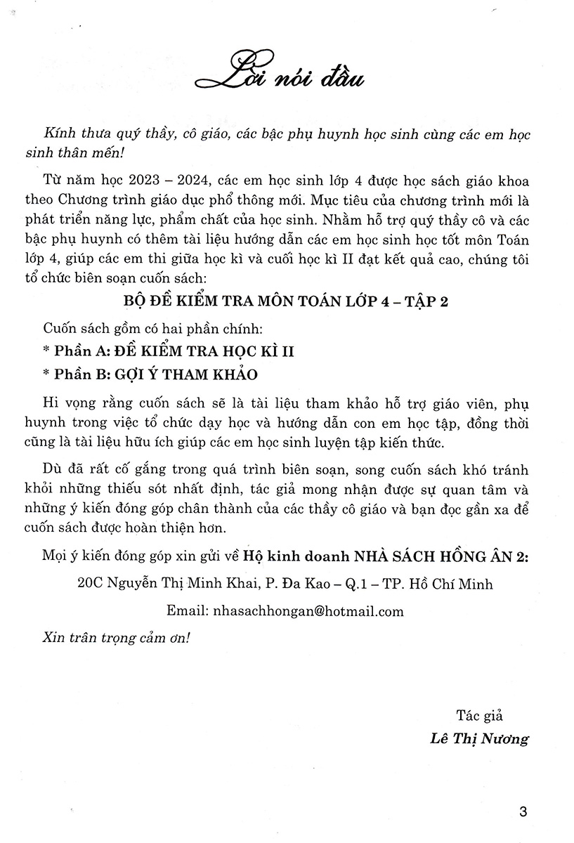 Từ năm học 2023 – 2024, các em học sinh lớp 4 được học sách giáo khoa theo Chương trình giáo dục phổ thông mới. Mục tiêu của chương trình mới là phát triển năng lực, phẩm chất của học sinh. Nhằm hỗ trợ quý thầy cô và các bậc phụ huynh có thêm tài liệu hướng dẫn các em học sinh học tốt môn Toán lớp 4, giúp các em thi giữa học kì và cuối học kì Il đạt kết quả cao, chúng tôi tổ chức biên soạn cuốn sách: