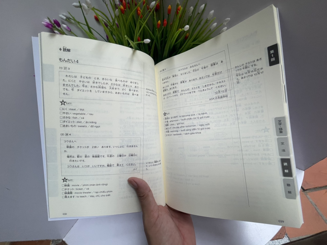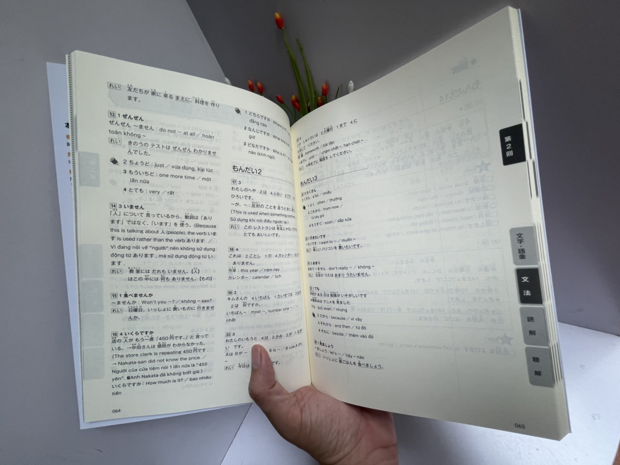 Bộ sách gồm 1 quyển: "Hán tự (Kanji) - Từ vựng (Goi) - Đọc hiểu (Dokkai) - Nghe hiểu (Choukai) - Ngữ pháp (Bunpou) Đây là một tựa sách học tiếng Nhật hàng đầu trong