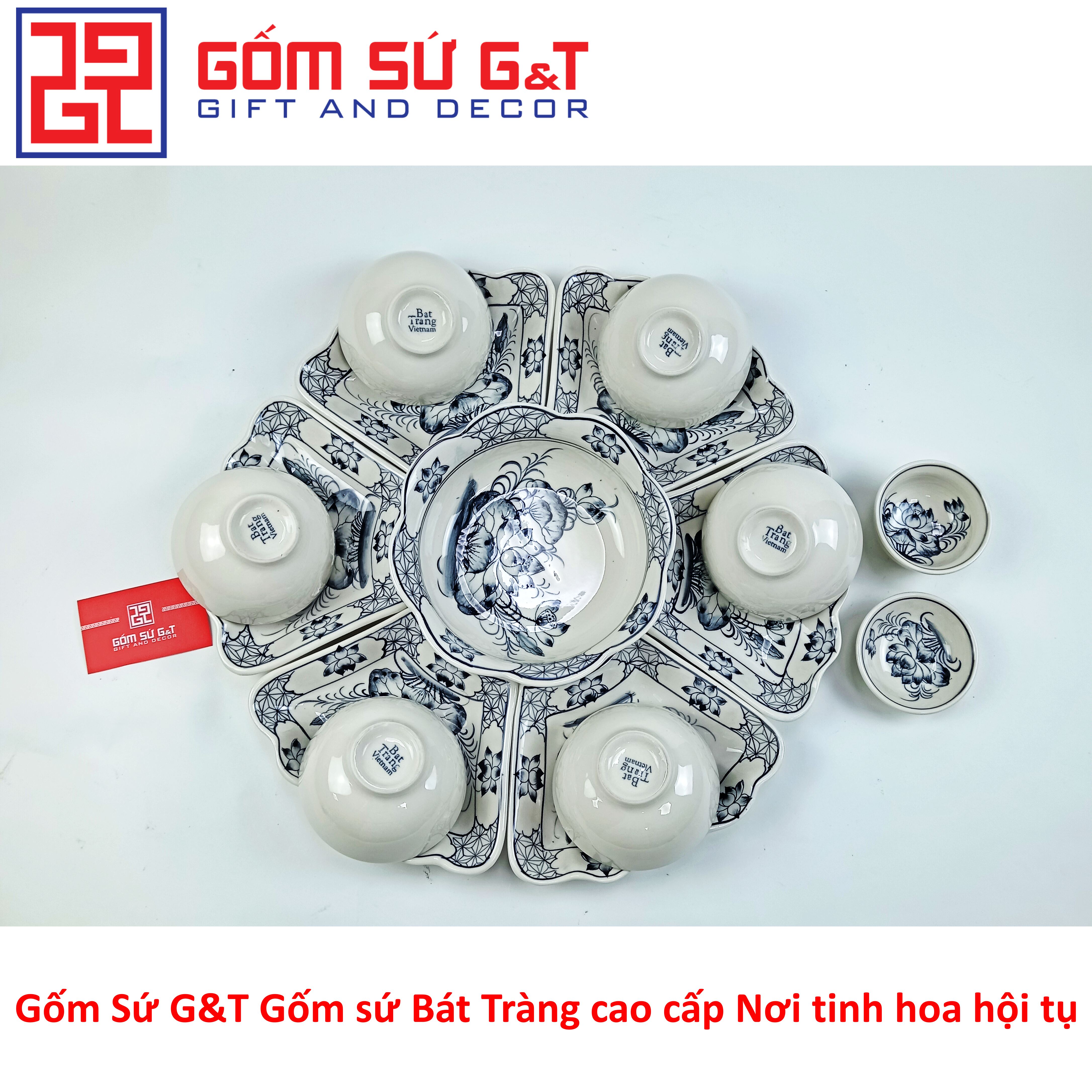 Bộ đồ ăn Bát Tràng - Sản phẩm bao gồm: 6 bát cơm, 1 mắm, 1 muối, 1 tô 16, 1 tô 18, 1 đĩa tròn 14, 1 đĩa tròn 16, 1 đĩa tròn 18,