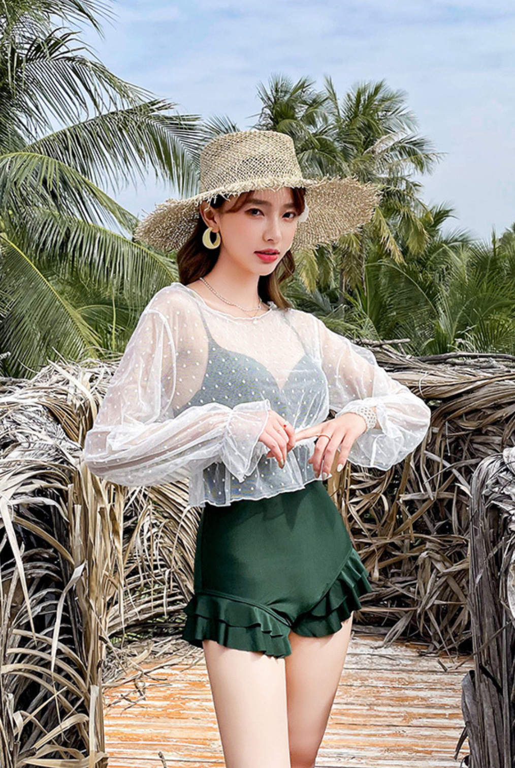 - Đơn giản nhưng vẫn cực kì nổi bật nhờ đường cong ôm sát, cách điệu với lớp bèo vừa che vai, vừa tôn vòng một các nàng ạ. - Bikini mặc đi biển làm