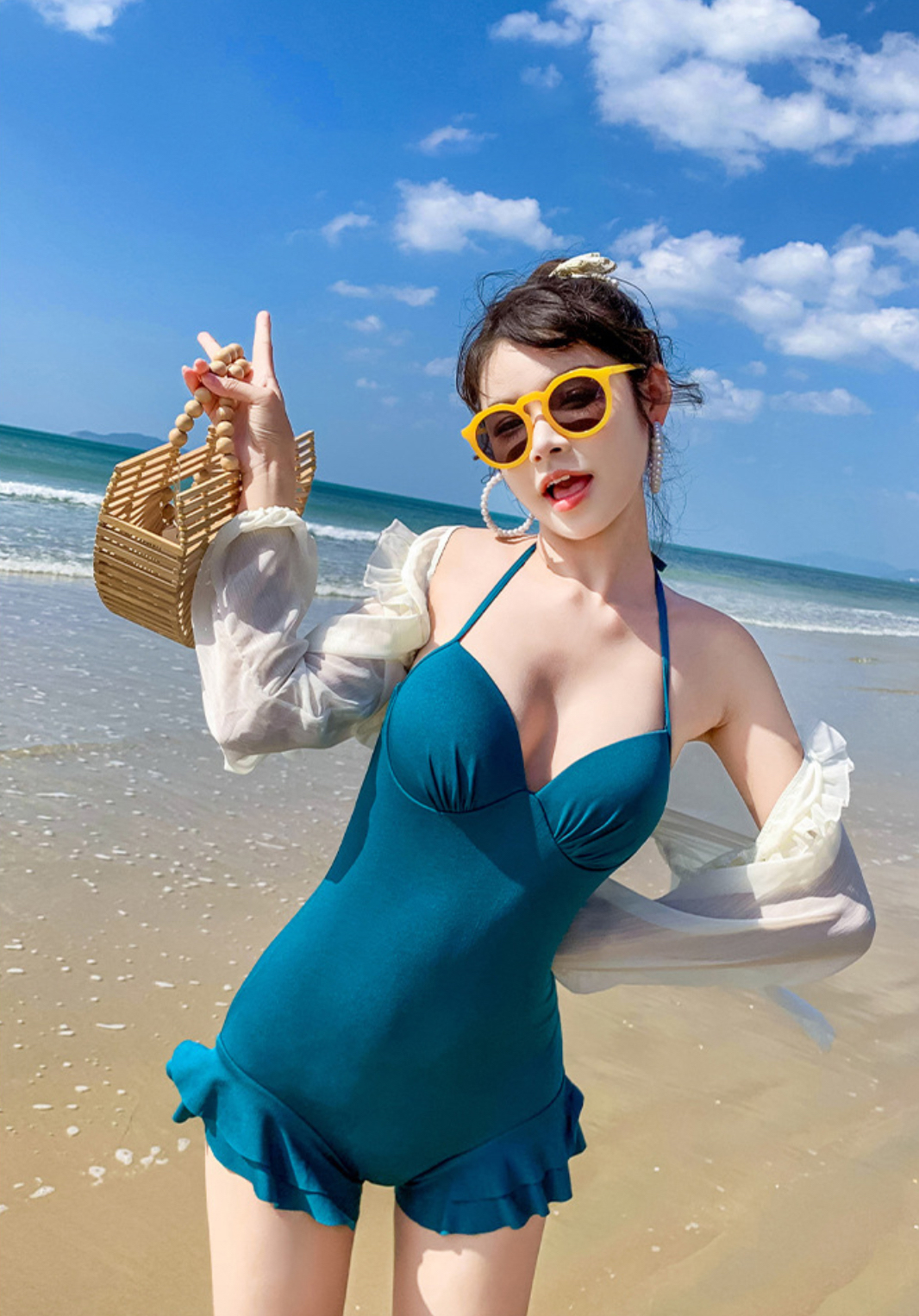 - Đơn giản nhưng vẫn cực kì nổi bật nhờ đường cong ôm sát, cách điệu với lớp bèo vừa che vai, vừa tôn vòng một các nàng ạ. - Bikini mặc đi biển làm