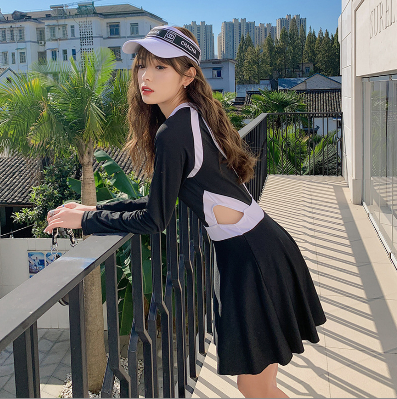 - Set gồm: váy liền (có quần đùi bên trong), áo tay dài che nắng Size (tùy chiều cao):