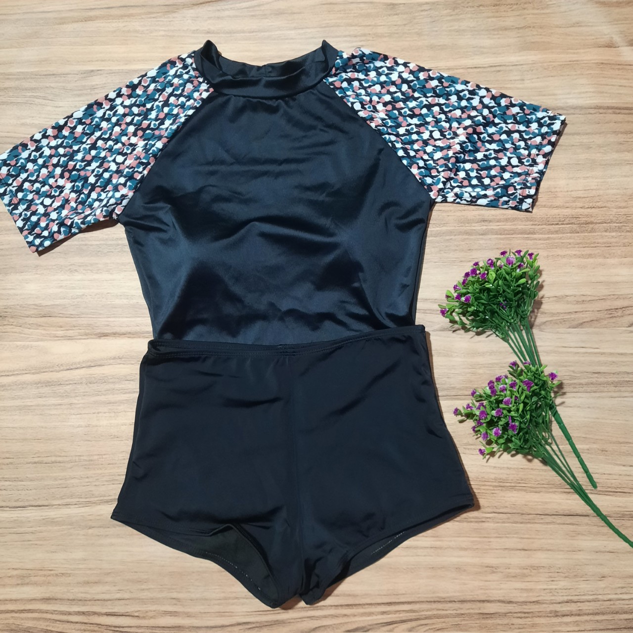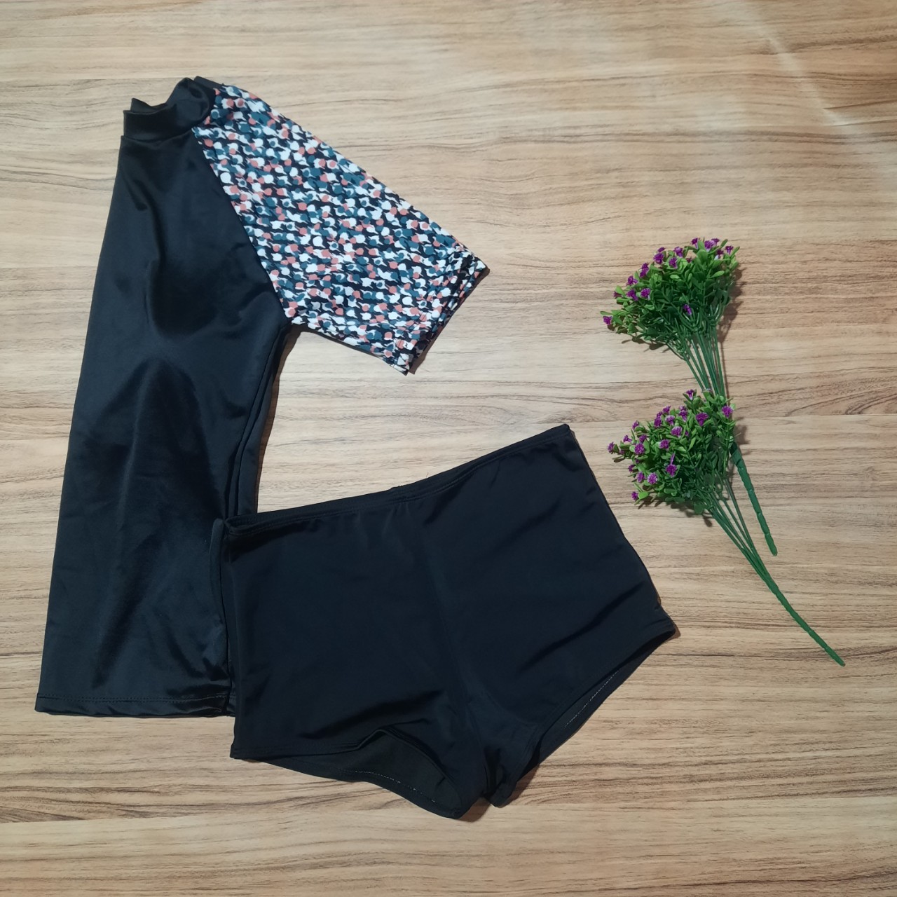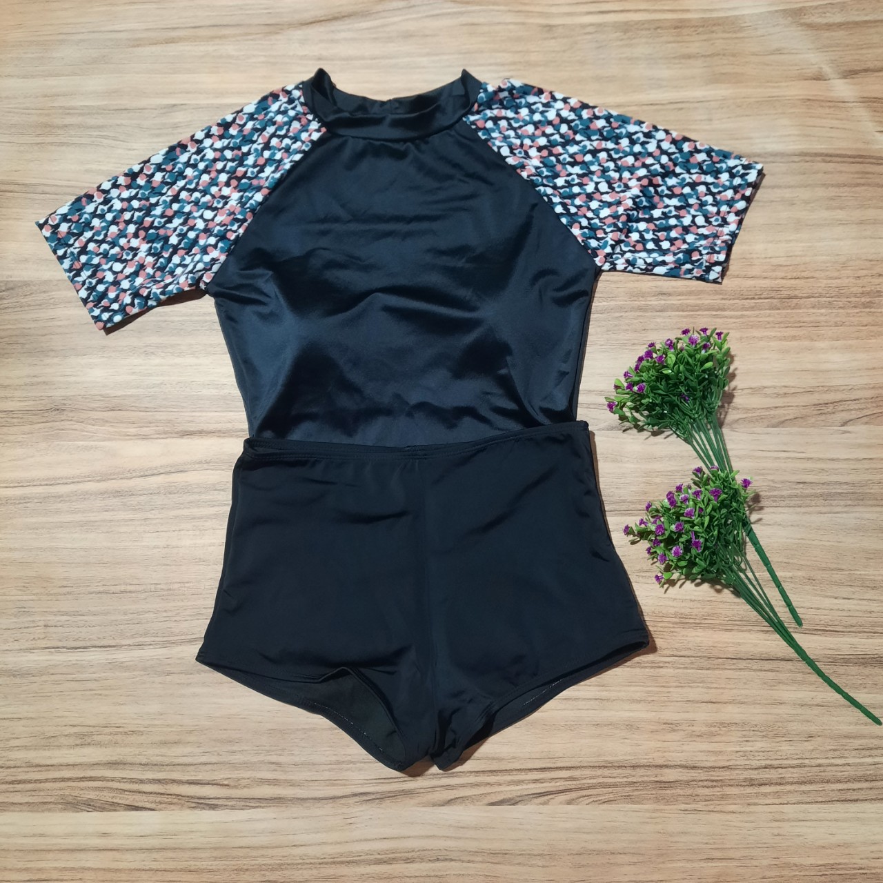 - Mẫu đồ bơi mới nhất cho các bạn nữ thích sự trẻ trung kín đáo mà vẫn thu hút khi đi biển, đi bơi. - Áo dáng ngắn tay phối hoạ tiết trẻ khoẻ,