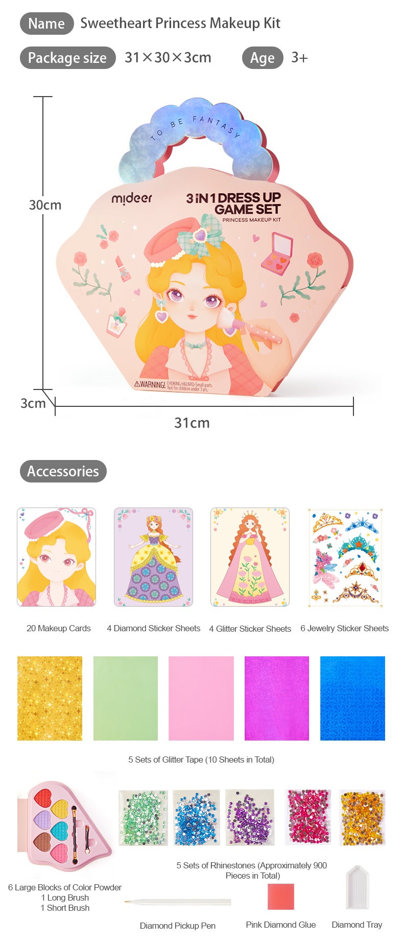 Bộ trang điểm Mideer bao gồm: 20 mẫu trang điểm công chúa, 4 mẫu nhãn dán kim cương, 4 mẫu nhãn dán sáng bóng, 4 nhãn dán, 6 màu, 900 viên kim cương, 10 chất liệu vải, 1 tấm, 1 bút đính cương, 1 keo dán, 2 cọ trang điểm