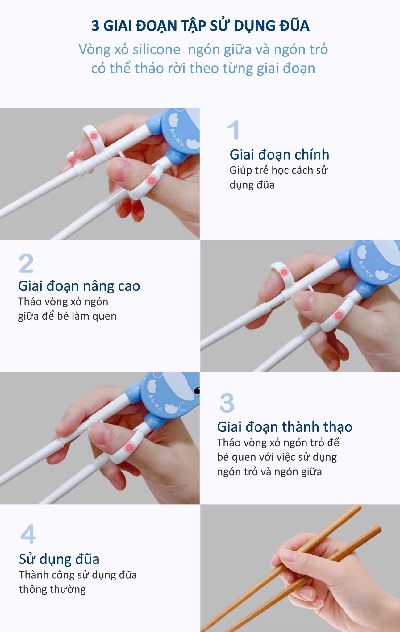 - Vòng xỏ ngón có thể tháo rời ngón xỏ và ngón giữa tùy theo từng giai đoạn tập cầm đũa;