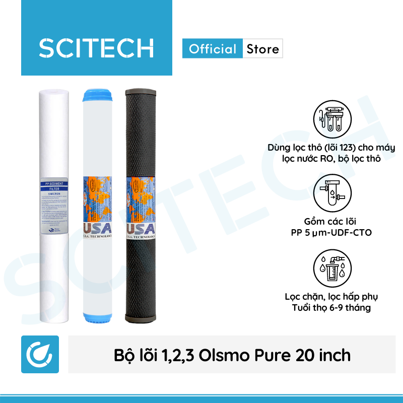 ✨Bộ lõi lọc nước số 1,2,3 (PP-UDF-CTO) 20 inch Olsmo Pure by Scitech dùng trong máy lọc nước RO, bộ lọc thô - Hàng chính hãng