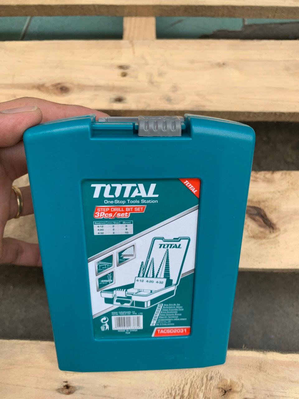 -Bộ 3 mũi khoan chóp nón gồm:1 pcs 4-12 mm, 1mm/bậc , đk đuôi: 6mm. 1 pcs 4-20 mm, 2mm/bậc , đk đuôi: 8mm