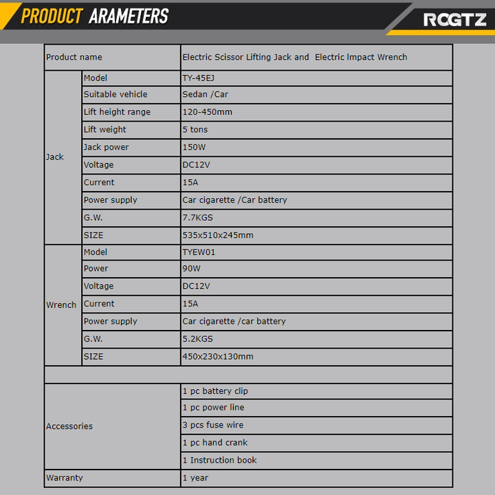 Tên: Kích điện Điện áp: DC 12V Công suất: 150W Chịu tải: 5T Trọng lượng tịnh: 4,5kg Chiều cao: 15,5-45CM Dung lượng pin: 6000MA Tên: Cờ lê điện Điện áp: DC 12V Mô-men xoắn: 350N.M