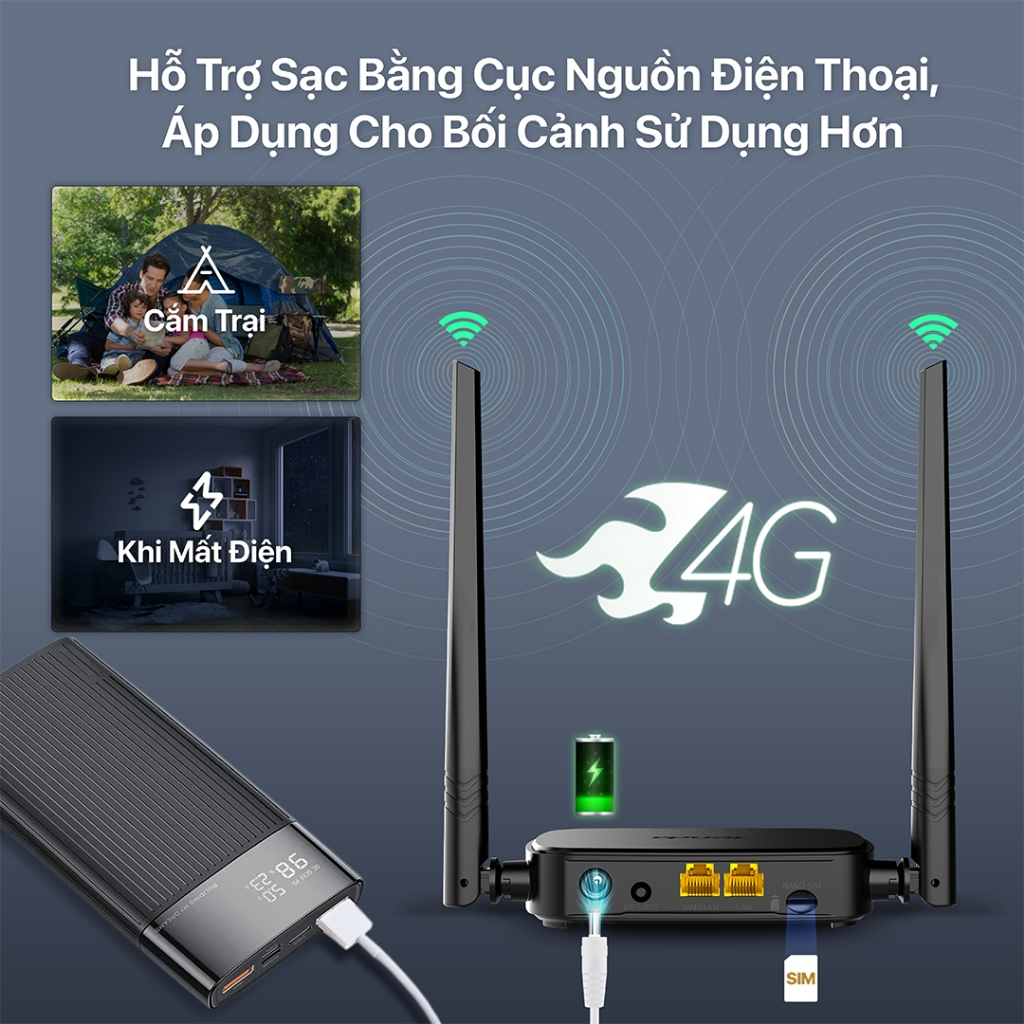 Router Wi-Fi 4G LTE Tốc Độ 300 Mbps ● Mạng 4G tiên tiến – chia sẻ truy cập internet với nhiều thiết bị Wi-Fi tận hưởng tốc độ download lên tới 150Mbps ● Không cần