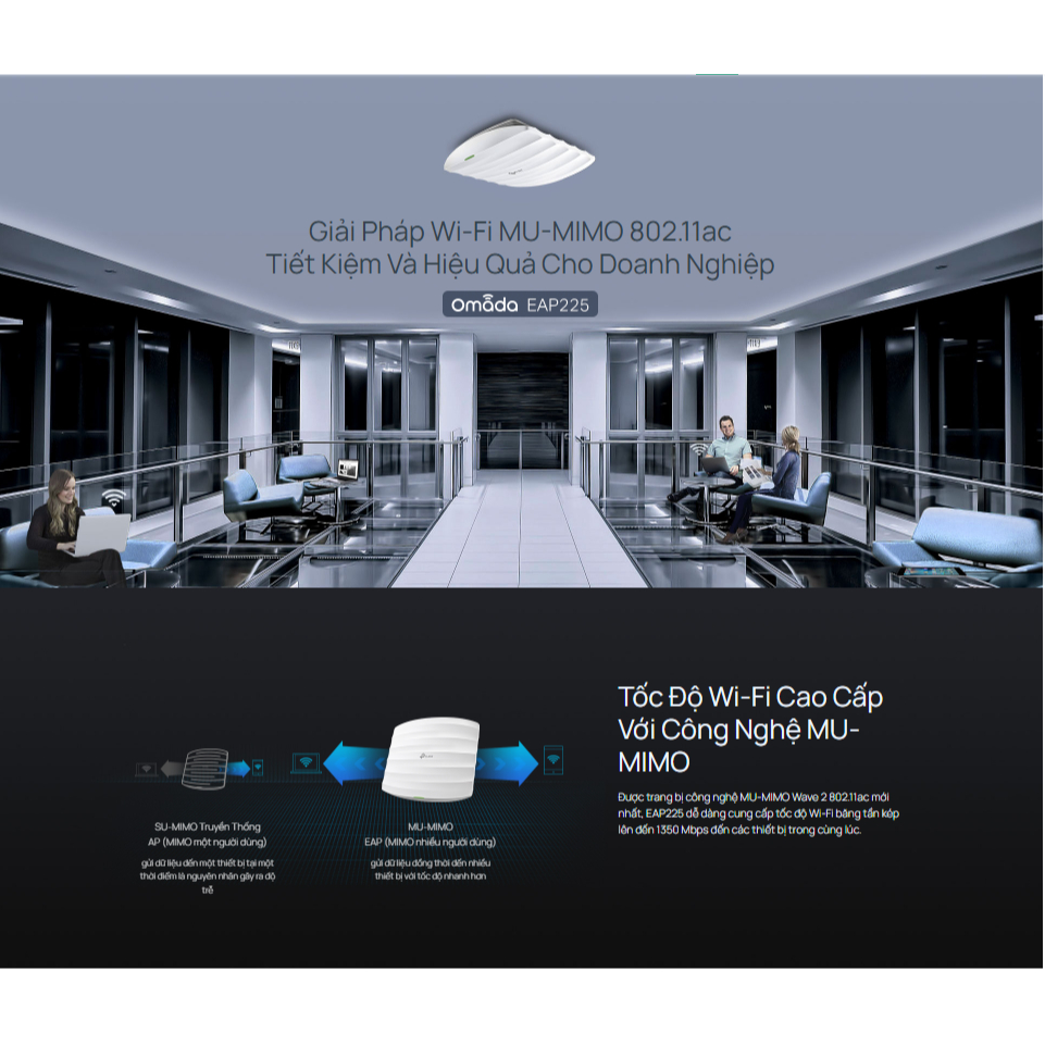 Access Point Wi-Fi Gắn Trần Gigabit AC1350 MU-MIMO -Wi-Fi Băng Tần Kép Nhanh: Đồng thời 450 Mbps trên 2.4 GHz△ và 867 Mbps trên 5 GHz đồng thời, tổng cộng là 1317 Mbps tốc độ Wi-Fi.† -Được tích hợp vào Omada SDN: Zero-Touch Provisioning (ZTP)‡, Quản lý cloud tập trung và Giám sát thông minh. -Quản Lý Tập Trung: Truy cập cloud và ứng dụng Omada để quản lý cực kỳ tiện lợi và dễ dàng. -Chuyển Vùng Liền Mạch: Ngay cả các luồng video và cuộc gọi thoại cũng không bị ảnh hưởng khi người dùng di chuyển giữa các vị trí -Hỗ Trợ PoE: Hỗ trợ cả chuẩn 802.3af / at và Passive PoE (bao gồm bộ chuyển đổi PoE)△ để cài đặt linh hoạt. -Mạng Khách An Toàn: Cùng với nhiều tùy chọn xác thực (SMS / Voucher, v.v.) và các công nghệ bảo mật không dây phong phú. -Công Nghệ Không Dây Tiên Tiến: Tối ưu hóa hiệu suất mạng với các công nghệ MU-MIMO, Band Steering, Airtime Fairness và Beamforming.△