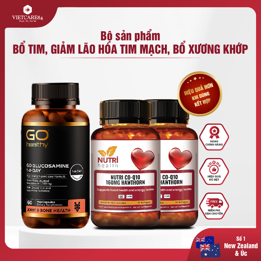 ✨Bộ Sản Phẩm Bổ Tim, Bổ Xương Khớp New Zealand: 2 Hộp Bổ Tim Nutri Co Q10 160g Hawthorn -30 Viên; Go Glucosamine 1-A-Day 1500mg - 60 Viên