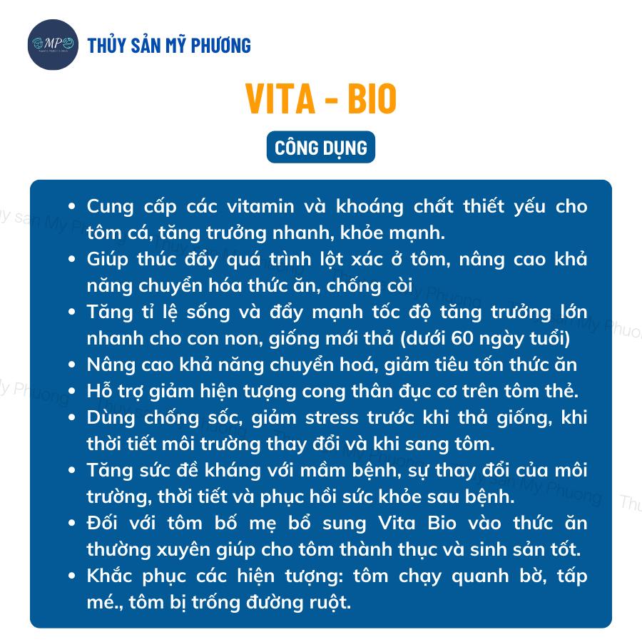 - Vita Bio là sản phẩm bổ sung vitamin, khoáng chất đa lượng, cần thiết cho sự phát triển của tôm, cá, lươn, ếch, ốc, ba Đặc biệt đây là sản phẩm khuyên dùng cho con non, giống mới thả (dưới 60 ngày). CÔNG DỤNG của tăng sức đề kháng Vita Bio: