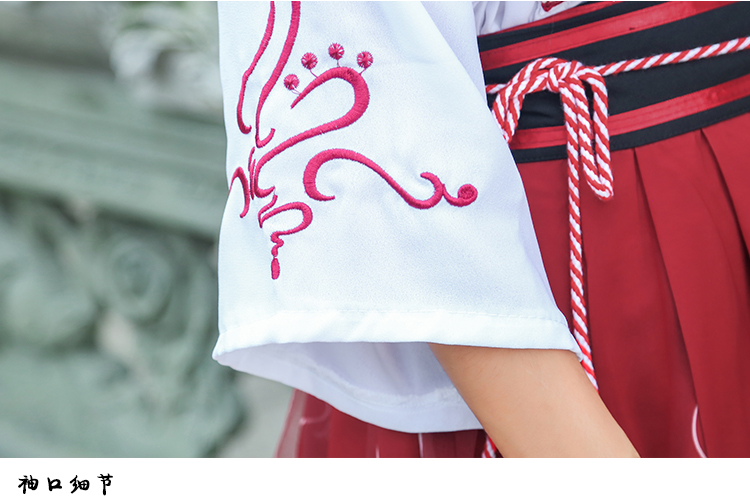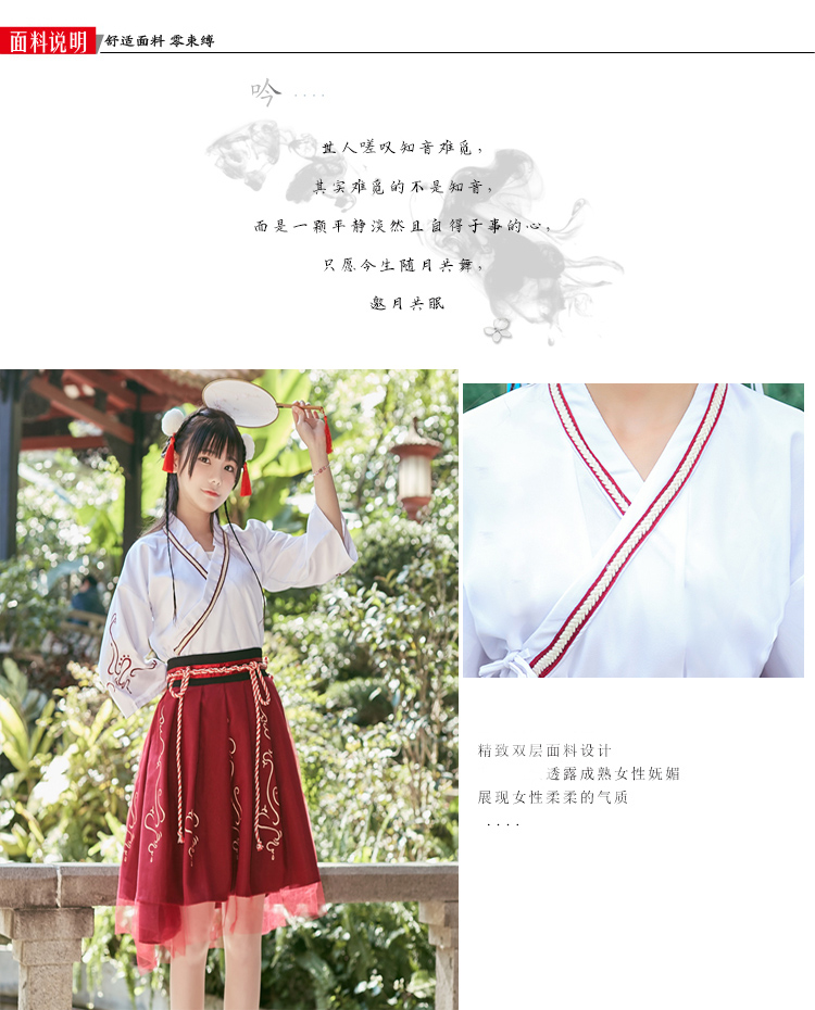 Kiểu dáng: trang phục Hán Phục cách tân Màu sắc: Áo màu trắng, Đầm màu đỏ Kích thước: Freesize (Vòng ngực 92cm, Áo dài 49cm, Tay dài 48cm, Váy dài 58cm) Bộ sản phẩm: gồm
