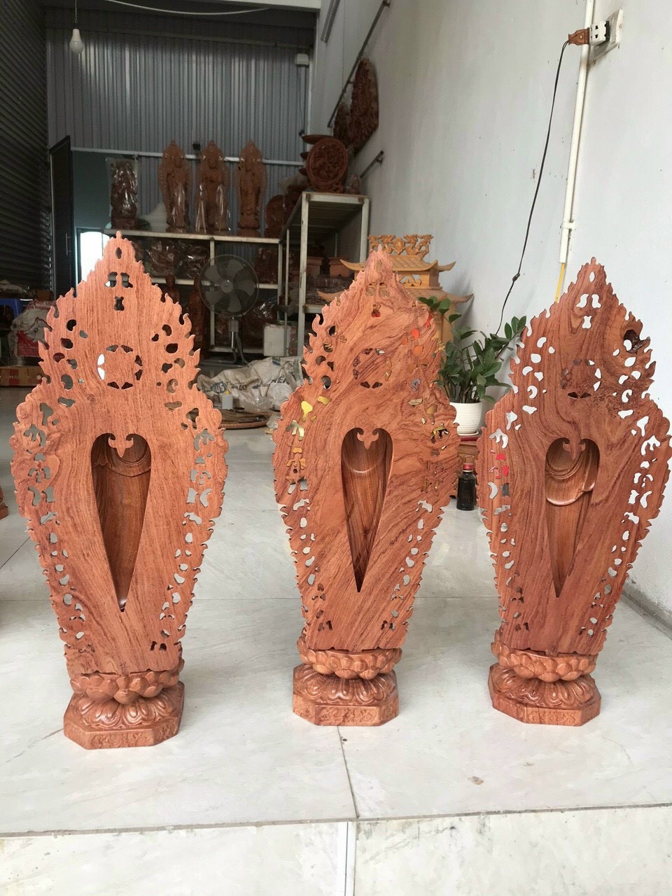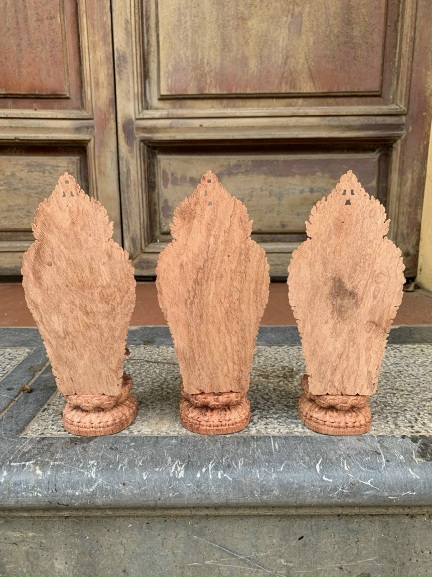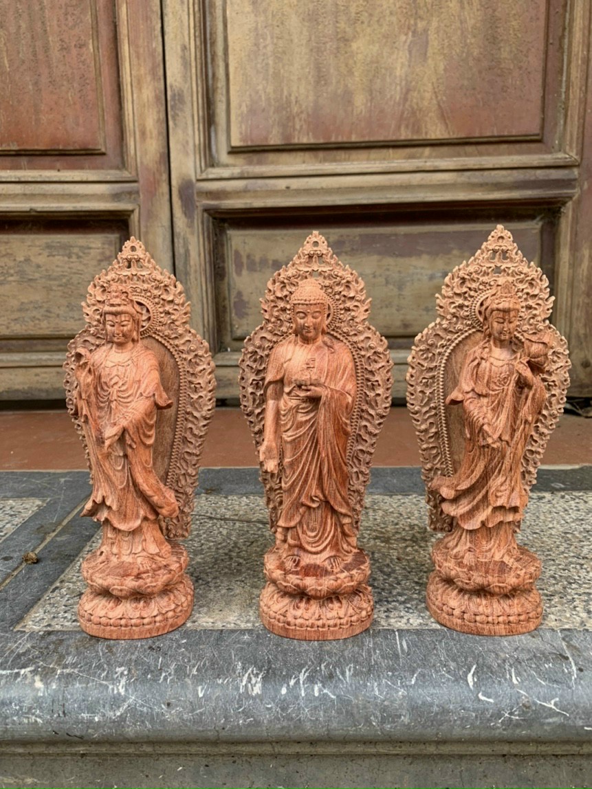 Bộ tượng phật tam thánh được làm bằng chất liệu gỗ hương đá tự nhiên 100% Kích thước cao 40 ngang12sâu 12cm Đằng sau có lá chắn hòa quang kt cao 49cm Bộ tượng phật tam thánh được trạm khắc tỉ mỉ tinh sảo kỳ công .Đi hầu hết mọi chi tiết góc ngách nội dung hoa văn của tượng phật đều được ngọt tỉa chỉnh sửa hoàn toàn bằng tay thủ công .Đồng thời tượng phật được kiểm định rất kỹ lưỡng như cho vào thẩm sấy cho gỗ khô kiệt .Mục đích trống dập nứt vênh mo mối mọt .Kết hợp với trà nhám đánh giấy giáp cho sạch sẽ sờ mát lạnh song cho vào phun lót làm bóng mờ để giữ lại mầu sắc vân gỗ tự nhiên  .Bộ tam thánh được làm và hoàn thiện do bàn tay khối óc tài hoa .Từ những người thợ dầy rặn kinh nghiệm cũng như tay nghề cao .Trong làng nghề truyền thống .Chính vì thế bộ tam thánh đã đáp ứng đầy đủ những tiêu trí ( Đẹp bền rẻ ) Thẩm mỹ nghệ thuật với chất lượng tuyệt vời