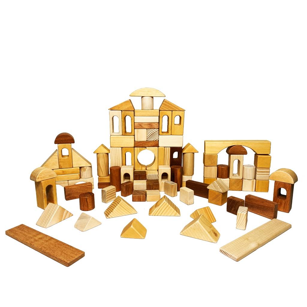 Bộ xếp khối hình học 99 chi tiết bằng gỗ bao gồm 99 miếng ghép khác nhau, có đủ các loại hình khối như khối vuông, chữ nhật, hình trụ, …cho bé kiến tạo những
