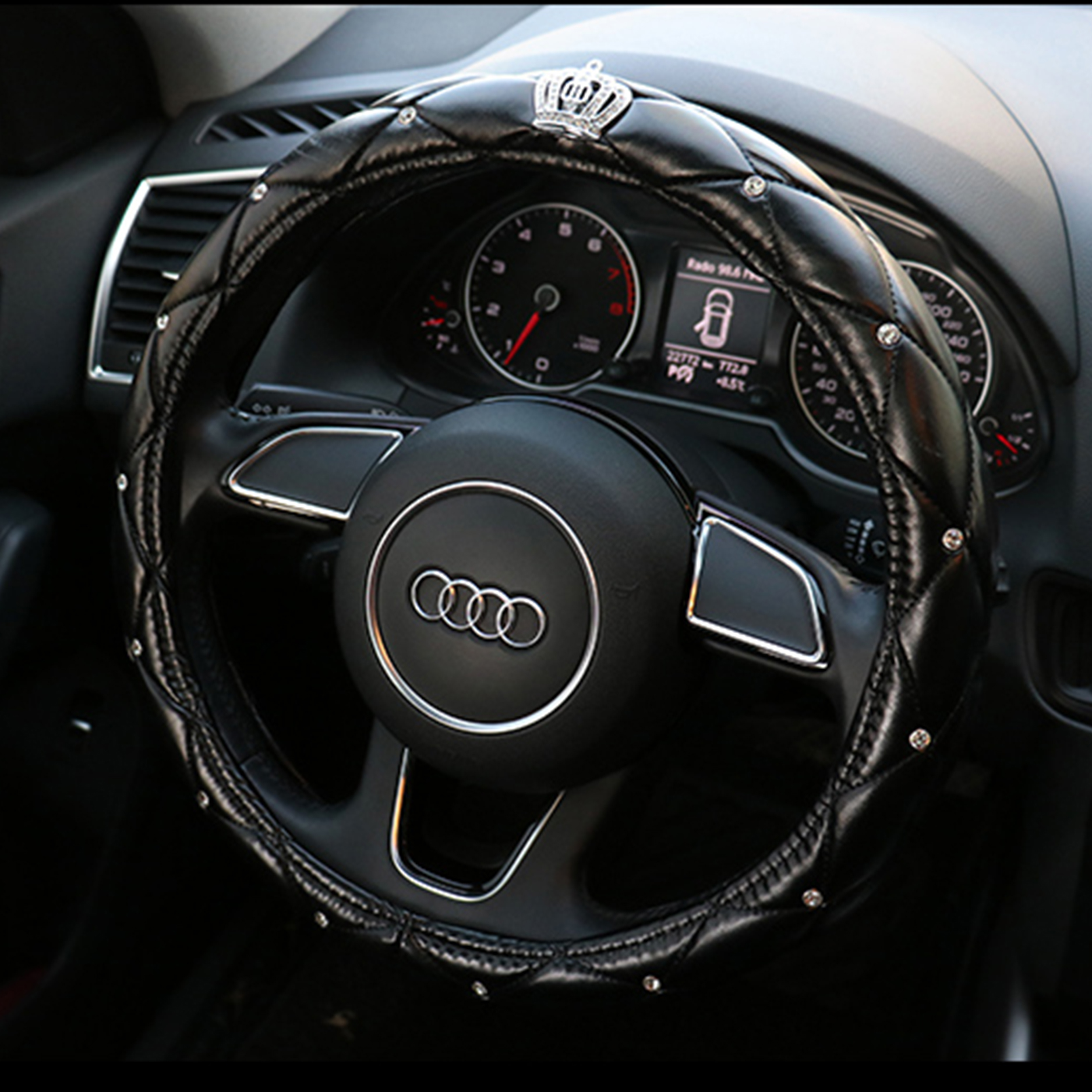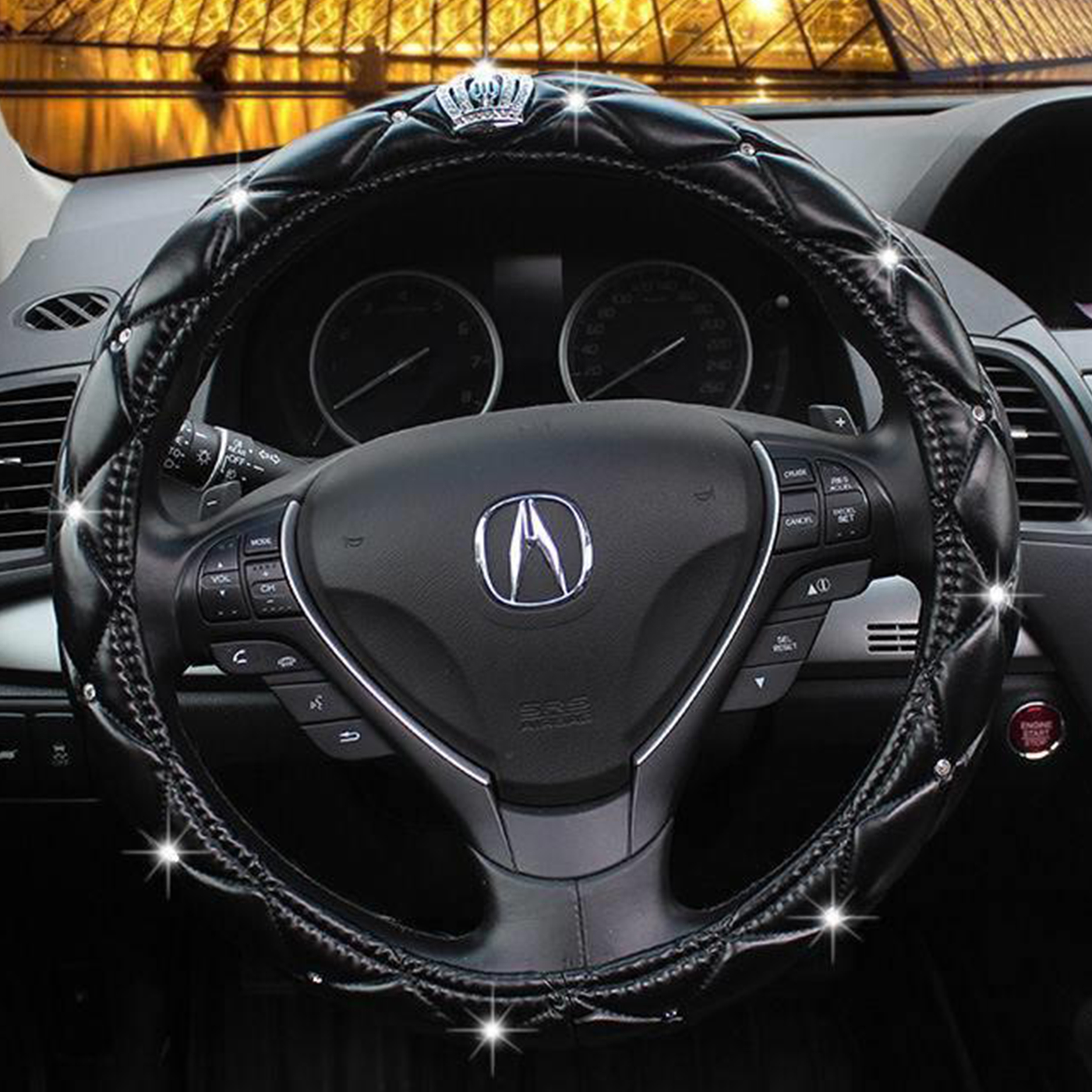 Bên ngoài được thiết kế đính đá thủ công tinh tế cùng các chi tiết phụ kiện đẳng cấp khác như lưới, vương miện…tạo điểm nhấn ấn tượng, sang trọng cho vô lăng của bạn.