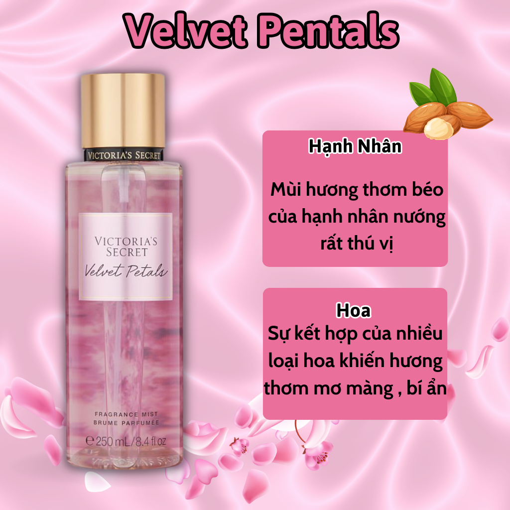 Body Mist Victoria Secret Chính Hãng Velvet Petals, Xịt Thơm Body Toàn Thân Hương Nước Hoa 250ml - Body Mist Victoria Secret là một trong những loại xịt thơm body thực sự để lại