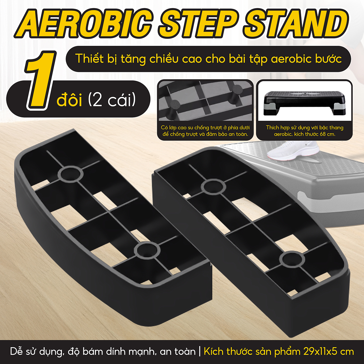 - Bục tập Aerobic có 2 mức điều chỉnh độ cao thấp 10 ; 15 của bục để phù hợp với nhiều người tập và bài tập khác nhau