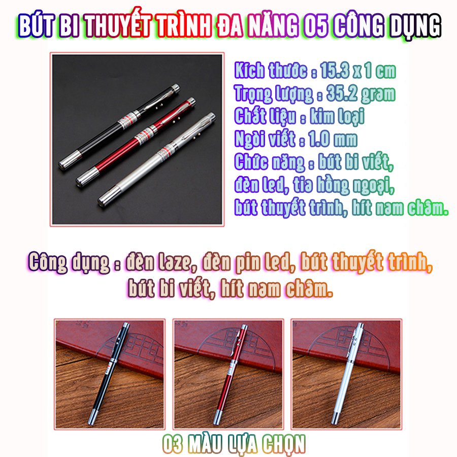 Mua tại TiktokBút thuyết trình Laser đa năng 5 trong 1. Vỏ bút được làm từ kim loại sơn tĩnh điện chắc chắn và không bong tróc màu. Thiết kế độc đáo và hiện đại với sự kết hợp 5 chức năng như bút viết, đèn laser, đèn led, bút chỉ bảng, hít kim loại. Thích hợp cho giảng viên, giáo viên hay các doanh nhân thường hay thuyết trình, giới thiệu. Bút tích hợp một đèn laser ở một đầu có tầm chiếu khá xa và đèn led chiếu sáng. Thân bút có thể kéo dài để làm dụng cụ chỉ dẫn, thuyết trình. Ngoài ra có thể sử dụng để viết chữ như một cây bút bình thường. Và có chức năng hít các vật dụng có chất kim loại như nam châm. Có 3 màu để lựa chọn : đen, đỏ, bạc.