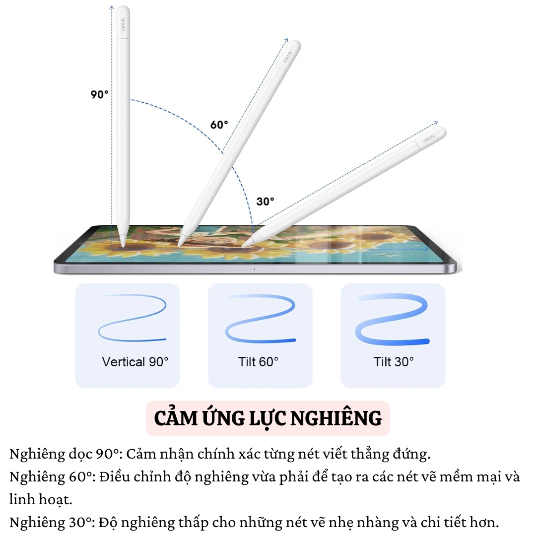 - Nhấn 3 lần: Chụp màn hình Chip thông minh, viết nhạy bén, không trễ Được trang bị chip thông minh, bút cảm ứng WIWU Stylus A01 mang đến trải nghiệm viết liền mạch, không độ trễ, và thao tác chính xác. Sạc từ tính siêu nhanh Với công nghệ sạc từ tính, bút có thể sạc nhanh chóng và dễ dàng. Cảm ứng độ nghiêng và lực nhấn Hỗ trợ cảm ứng độ nghiêng và lực nhấn ở các góc khác nhau: