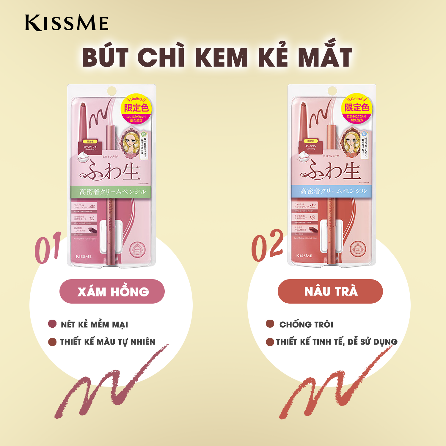 Thương hiệu: Kissme Xuất xứ: Nhật Bản Khối lượng: 1,6g HSD: 5 năm kể từ ngày sản xuất *PHÙ HỢP CHO NGƯỜI MỚI BIẾT TRANG ĐIỂM HOẶC THÍCH TONE MÀU TỰ NHIÊN. Nét kẻ mềm