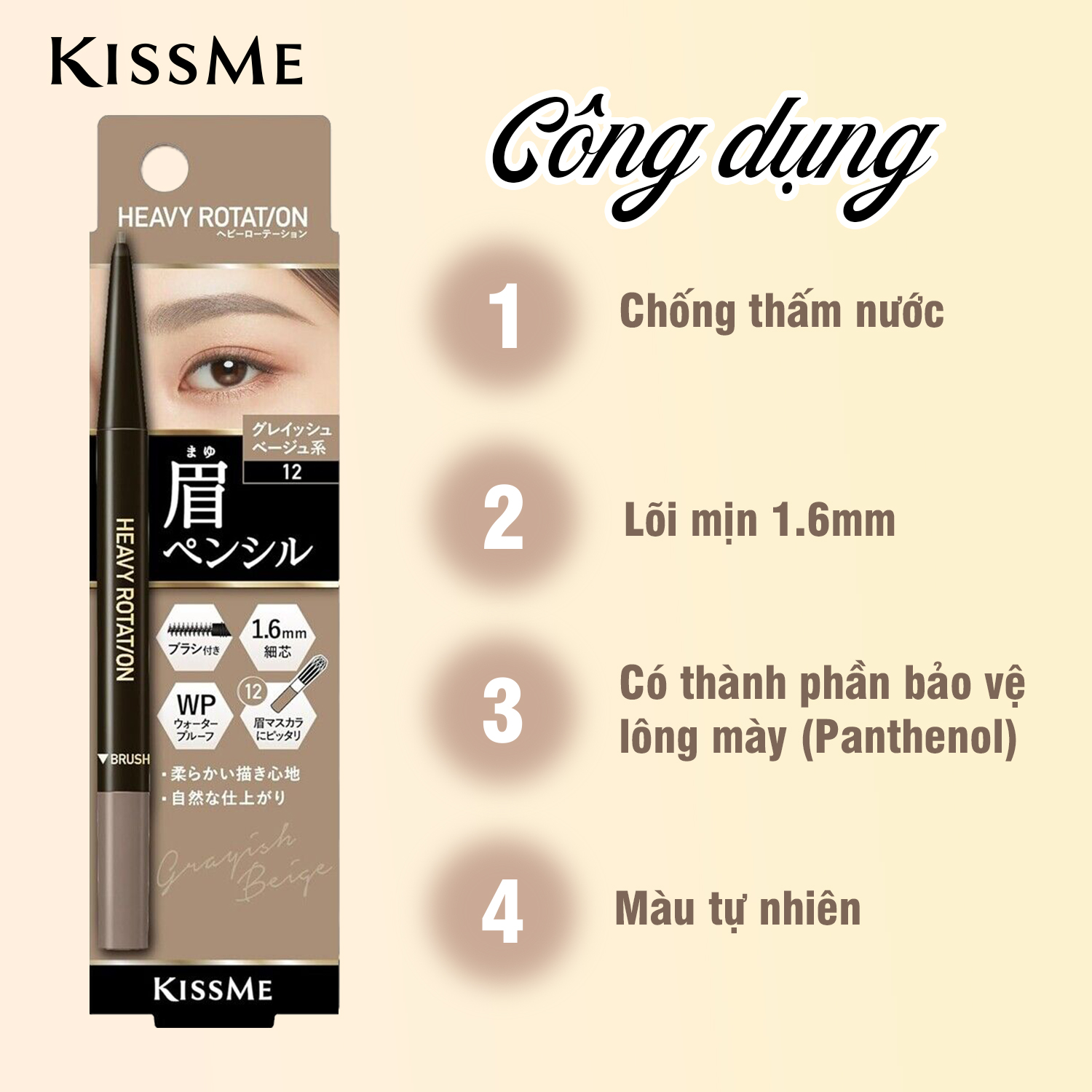 Mua tại TiktokBÚT CHÌ SÁP KẺ LÔNG MÀY KISSME HEAVY ROTATION LÕI SÁP CHỐNG TRÔI MÀU SẮC TỰ NHIÊN – MÀU XÁM BE #12 KISSME HEAVY ROTATION EYEBROW PENCIL Số Lô: In trên sản phẩm Khối lượng tịnh: 0.09g Mã Vạch: 4901433140751 Xuất Xứ: Nhật Bản Lõi sáp 1.6mm SIÊU MỊN – MÀU TỰ NHIÊN kết hợp CÔNG THỨC CHỐNG TRÔI CẢI TIẾN không thấm nước, chống mồ hôi, bã nhờn... Giúp bạn vẽ từng sợi lông mày một cách tự nhiên nhất. CÓ THỂ KẾT HỢP VỚI MASCARA CHẢI MÀU LÔNG MÀY CÙNG LOẠI ĐỂ TĂNG THÊM ĐỘ NHẤN CHO LÔNG MÀY. Công Dụng: Sản phẩm kẻ lông mày giúp trang điểm, tạo màu và tạo đường nét cho lông mày Cách Dùng: Kẻ ½ đoạn sau đuôi chân mày, sau đó dùng đầu bàn chải tán đều màu. Tương tự các bước, kẻ tiếp ½ đoạn đầu chân mày cho đến khi có màu vẽ phù hợp. CHỈ VẶN 1.5-2MM CHO MỖI LẦN KẺ ĐỂ TRÁNH GÃY LÕI SÁP. Bảo Quản: Tránh để nơi quá lạnh và ánh nắng trực tiếp vào sản phẩm, để xa tầm tay trẻ em khi không sử dụng. Lưu Ý: Khi dùng nếu có biểu hiện như mẩn ngứa hay có triệu chứng gì bất thường thì ngừng không được sử dụng. Thành Phần: Mica, Behenic Acid, Rhus Succedanea Fruit Wax, Titanium Dioxide, Phytosteryl/Isostearyl/Cetyl/Stearyl/Behenyl Dimer Dilinoleate, Triethylhexanoin, Hydrogenated Castor Oil, Sucrose Tetrastearate Triacetate, Sorbitan Sesquiisostearate, Aluminum Hydroxide, Tocopherol, Panthenol, CI 77492, CI 77499, CI 77491 NHÀ SẢN XUẤT: ISEHAN CO., LTD NHÀ NHẬP KHẨU VÀ CHỊU TRÁCH NHIỆM ĐƯA SẢN PHẨM RA THỊ TRƯỜNG: CÔNG TY TNHH TM DV HÒA PHÚC