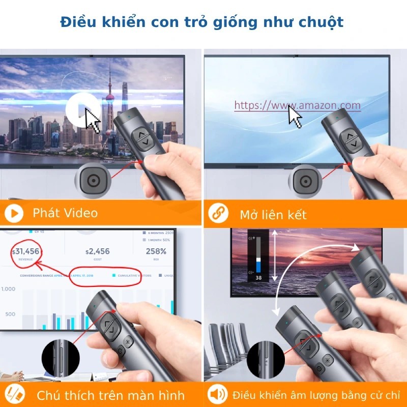 - Tính Năng Đa Dạng: Thiết bị hỗ trợ các chức năng như làm nổi bật, phóng đại, laze kỹ thuật số, chuột không khí, di chuyển lên/xuống trang, và màn hình đen toàn màn hình. Nó còn đi kèm với tính năng tẩy mực kỹ thuật số và điều chỉnh âm lượng bằng cử chỉ, cung cấp sự linh hoạt trong các tình huống trình chiếu khác nhau.