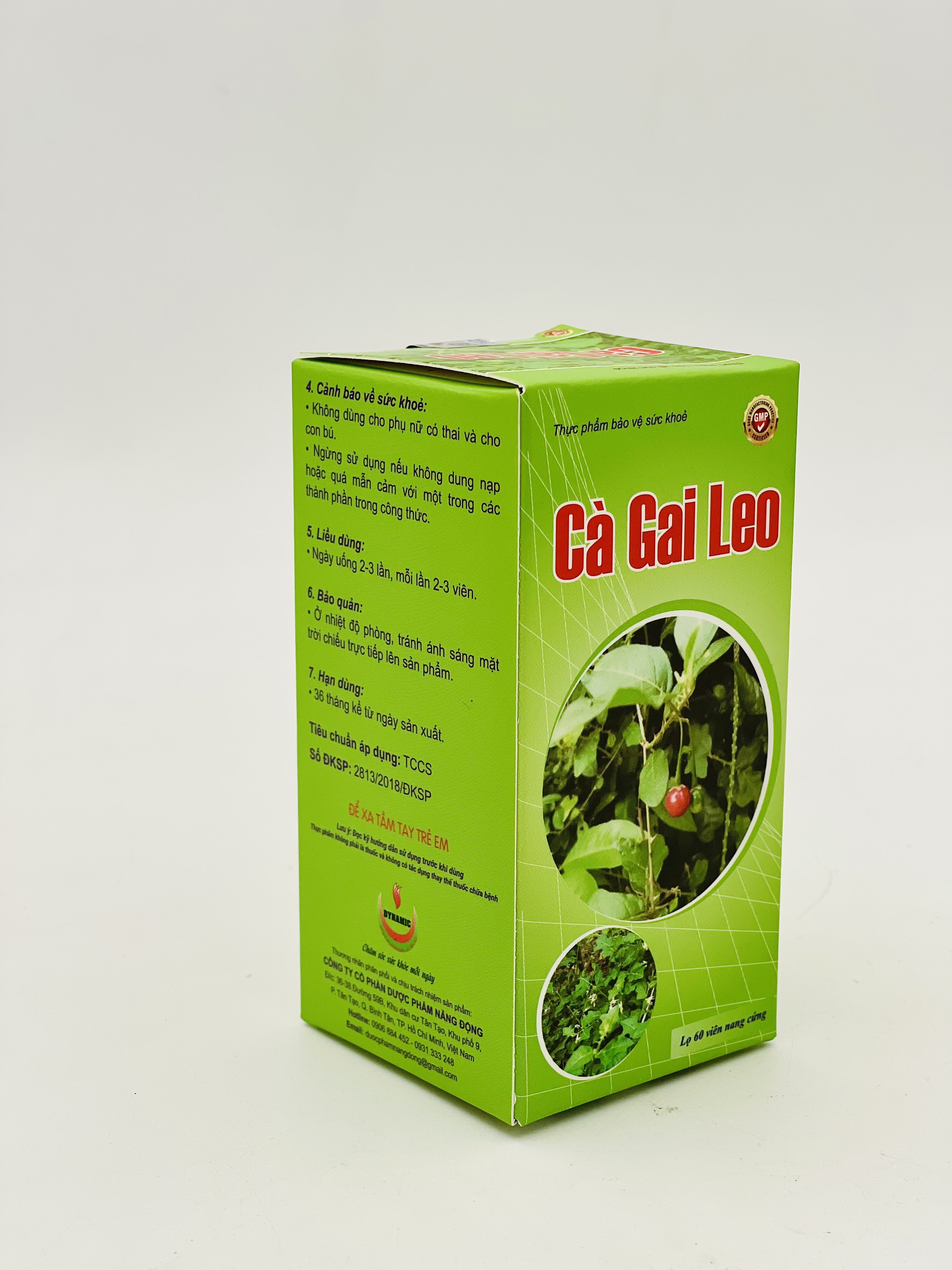 Mua tại TiktokCÀ GAI LEO – NĂNG ĐỘNG Cà Gai Leo được biết đến với nhiều công dụng như: tăng cường chức năng giải độc gan, hạn chế tổn thương tế bào gan, giảm các triệu chứng dị ứng, nổi mề đay, vàng da mệt mỏi do suy giảm chức năng gan Được phân phối bởi Công ty Cổ Phần Dược Phẩm Năng Động Với thành phần dược liệu tự nhiên: ️Cao cà gai leo ️Cao mật nhân ️Và các phụ liệu: Canxi cacbonat, tinh bột sắn, bột talc Đối tượng sử dụng: ️Người bị suy giảm chức năng gan do viêm gan virus, viêm gan B, mạn tính, xơ gan. ️Người bị men gan cao, vàng da mệt mỏi. ️Người uống rượu bia nhiều. Hướng dẫn sử dụng: ️Ngày uống 2-3 lần, mỗi lần 2-3 viên Bảo quản: Ở nhiệt độ phòng, tránh ánh nắng mặt trời chiếu trực tiếp lên sản phẩm. Công ty Cổ Phần Dược Phẩm Năng Động