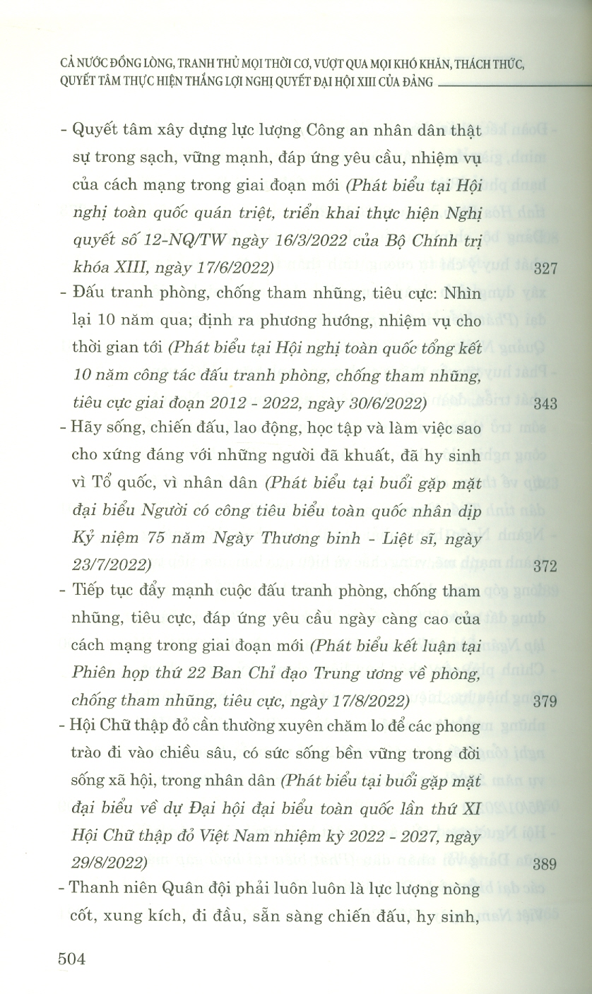 Cuốn sách "Cả nước đồng lòng, tranh thủ mọi thời cơ, vượt qua mọi khó khăn, thách thức, quyết tâm thực hiện thắng lợi Nghị quyết Đại hội XIII của Đảng" chọn lọc các bài viết, bài phát biểu của đồ...