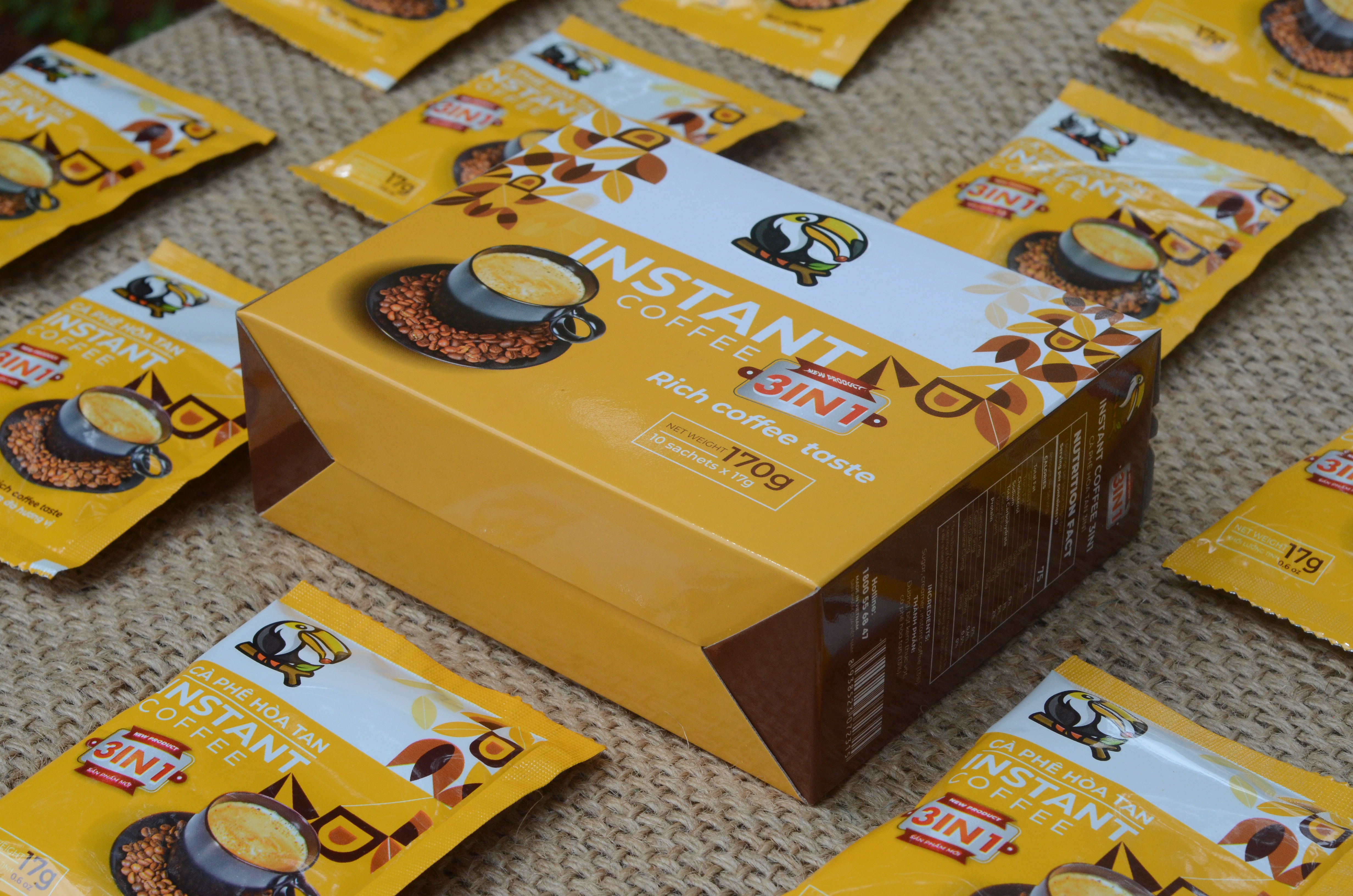 CÀ PHÊ HÒA TAN 3in1 – HỘP 170G: - Xuất xứ: Việt Nam - Thành phần: Đường, bột kem thực vật, cà phê hòa tan (13%) - Quy cách đóng gói: 10 gói x 17g/gói