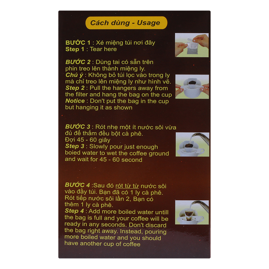 - Thiết kế dạng phin giấy giúp bạn dễ dàng sử dụng. Bạn chỉ cần cho phin giấy vào ly, cho nước ngập phần bột cà phê, chờ đợi và cho thêm que đường đi kèm vào là đã có một ly cà phê thơn ngon, đậm đà.