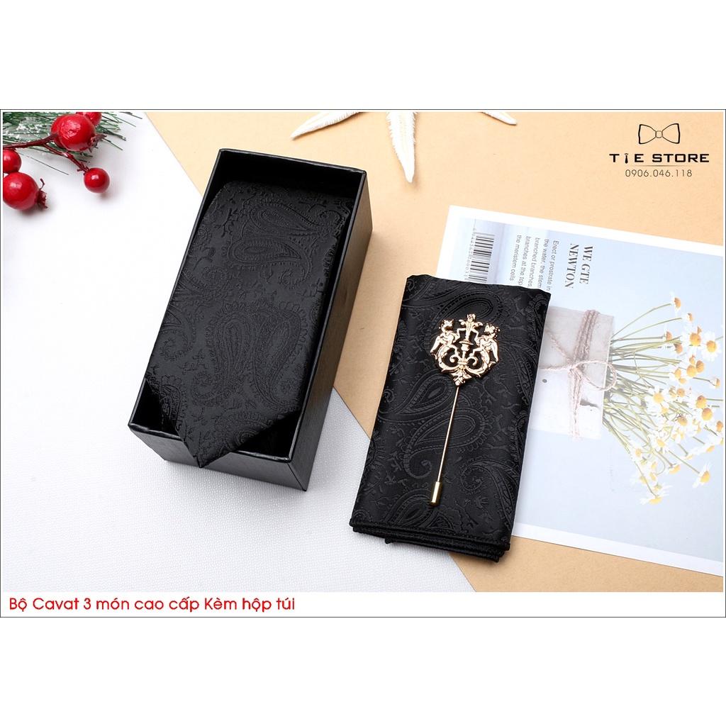 ✨Ca Vat bộ 3 món kèm hộp túi xách cao cấp, quà tặng chú rể, Cavat họa tiết đen retro Paislay