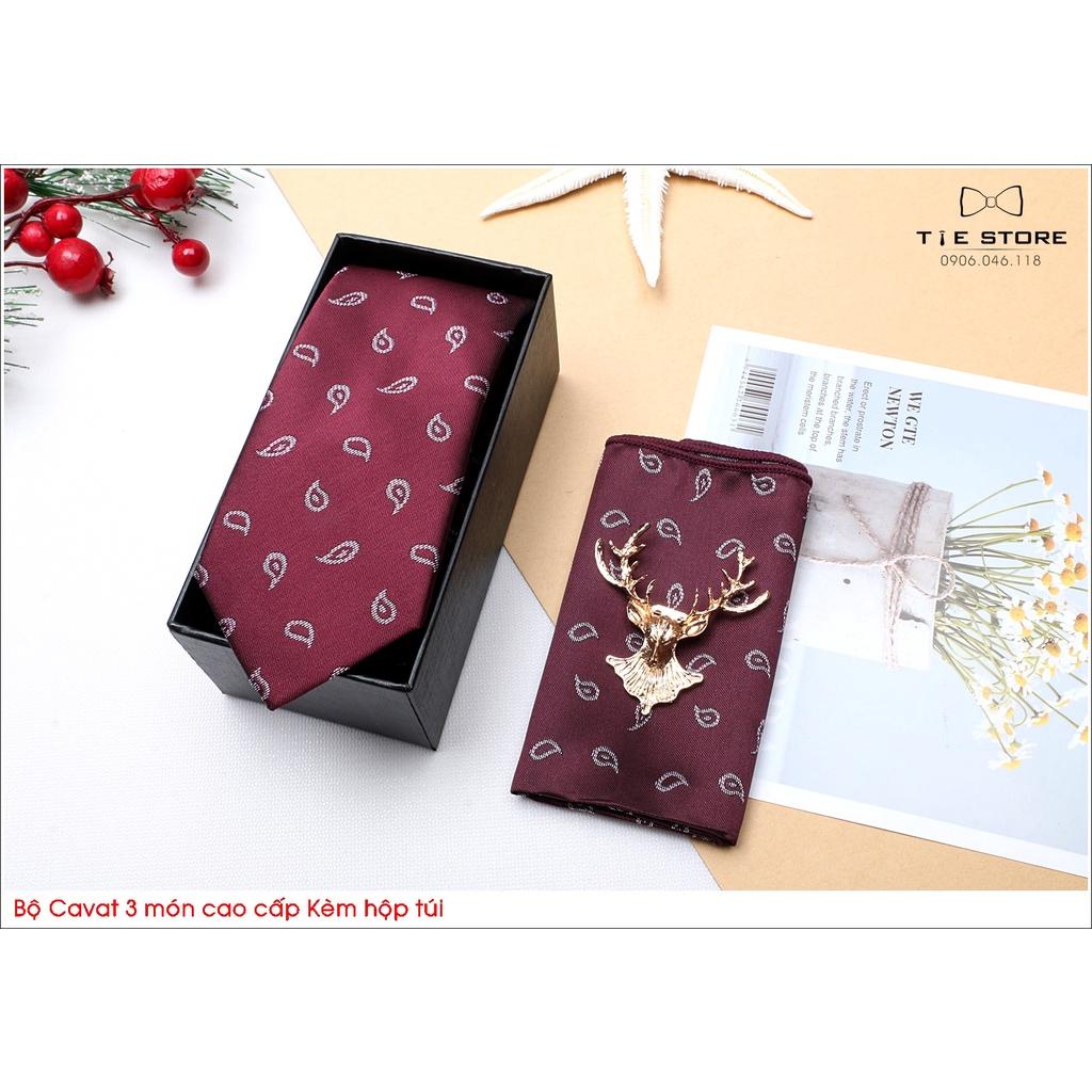 ✨Ca Vat bộ 3 món kèm hộp túi xách cao cấp, quà tặng chú rể, Cavat họa tiết đỏ mận