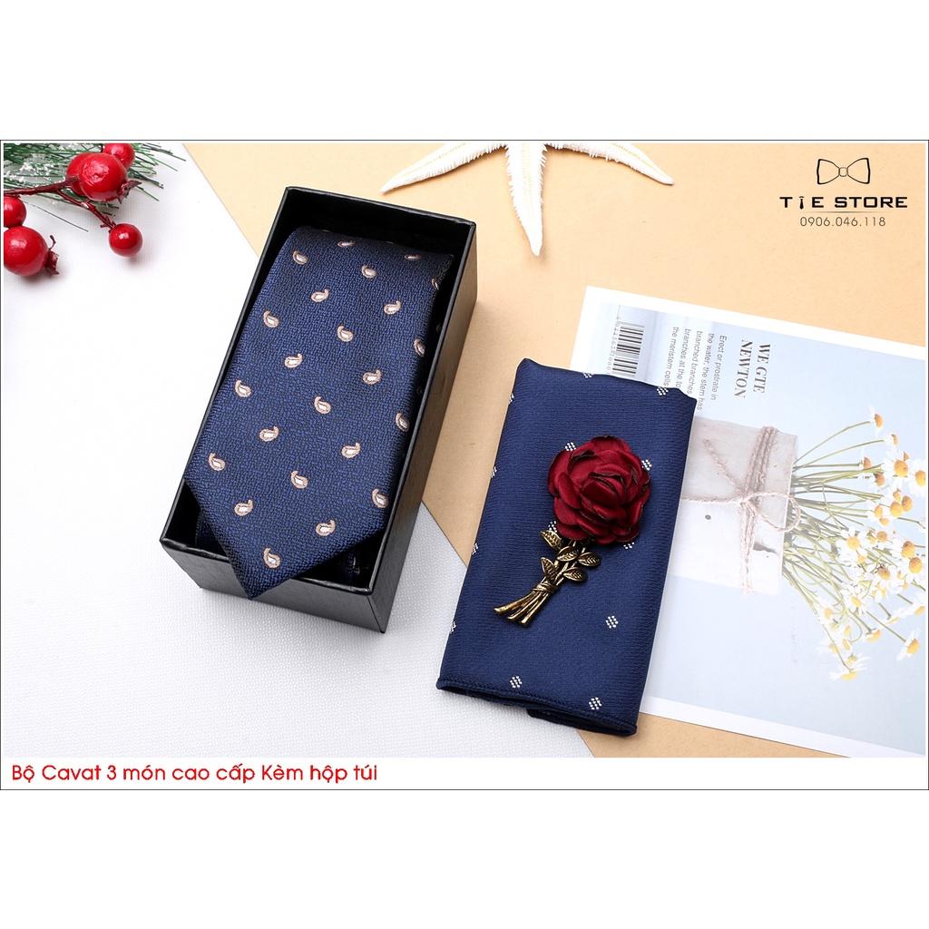 ✨Ca Vat bộ 3 món kèm hộp túi xách cao cấp, quà tặng chú rể, Cavat họa tiết xanh đen chấm