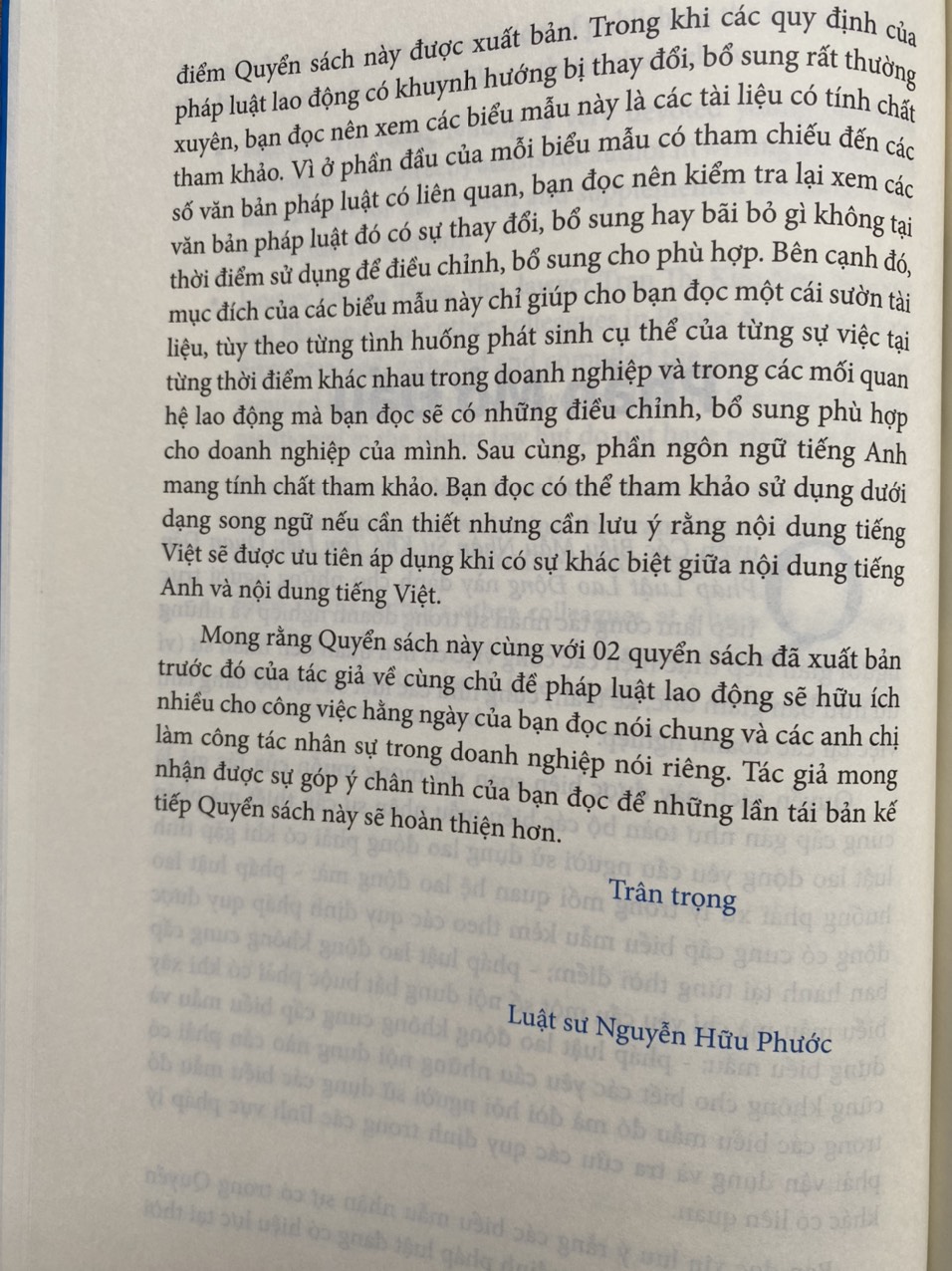 Cuốn sách ” Các Biểu Mẫu Nhân Sự Khó Tìm Liên Quan Đến Pháp Luật Lao Động ” dễ dàng tra cứu và tìm được các thông tin pháp luật lao động hữu ích và thực tế có liên quan đến công tác nhân sự và quản lý nhân sự trong doanh nghiệp. Chia sẻ hơn 20 năm kinh nghiệm tư vấn và cung cấp các giải pháp pháp lý cho cá nhân và doanh nghiệp trong và ngoài nước. Dành cho những người trực tiếp làm công tác nhân sự trong doanh nghiệp và những người gián tiếp thực hiện các công việc có liên quan đến nhân sự (ví dụ như ban giám đốc, kế toán) cũng như các luật sư nội bộ đang làm việc tại các doanh nghiệ Cung cấp gần như toàn bộ các biểu mẫu nhân sự cần thiết mà pháp luật lao động yêu cầu người sử dụng lao động phải có khi gặp tình huống cần xử lý trong mối quan hệ lao động theo quy định pháp luật. Các biểu mẫu nhân sự về pháp luật lao động được trình bày dưới dạng song ngữ Việt Anh giúp độc giả thuận tiện tham chiếu và áp dụng phù hợp. — Quyển sách gồm có 11 Chương   Giới thiệu 11 Chương trong Các biểu mẫu nhân sự khó tìm liên quan đến Pháp luật Lao động.     Chương 1- Các biểu mẫu về Tuyển dụng lao động và thử việc Chương 2- Các biểu mẫu về Hợp đồng lao động Chương 3- Các biểu mẫu về Đào tạo nghề Chương 4- Các biểu mẫu về Đối thoại tại nơi làm việc Chương 5- Các biểu mẫu về Tiền lương Chương 6- Các biểu mẫu về Thời giờ làm việc và thời giờ nghỉ ngơi Chương 7- Các biểu mẫu về Nội quy lao động và kỷ luật lao động Chương 8- Các biểu mẫu về An toàn lao động và vệ sinh lao động Chương 9- Các biểu mẫu về Nhóm lao động đặc thù Chương 10 – Các biểu mẫu về Thành lập công đoàn cơ sở Chương 11 – Các biểu mẫu về Tranh chấp lao động và đình công —– Lý do bạn nên sở hữu quyển sổ tay này Quyển sách Các biểu mẫu nhân sự khó tìm liên quan đến Pháp luật Lao động giúp người làm công tác nhân sự giảm thiểu được thời gian tra cứu và soạn thảo các biểu mẫu pháp luật lao động cũng như vận dụng các quy định của pháp luật liên quan đúng và nhanh chóng. Các biểu mẫu không chỉ giúp cho độc giả các sườn tài liệu, mà tùy theo từng tình huống phát sinh cụ thể của từng vụ việc tại từng thời điểm khác nhau trong doanh nghiệp và trong các mối quan hệ lao động mà độc giả sẽ có những điều chỉnh, bổ sung phù hợp cho doanh nghiệp của mình. Tiết kiệm thời gian, công sức và tiền bạc cho độc giả trong quá trình tìm kiếm và lựa chọn từ các nguồn tư vấn pháp lý vô cùng đa dạng và phức tạp. Thống kê đầy đủ các biểu mẫu nhân sự quan trọng và cần thiết mà được trình bày dưới dạng song ngữ Việt Anh liên quan đến các vấn đề thường phát sinh trong mối quan hệ lao động giữa doanh nghiệp và người lao động.   xin trân trọng giới thiệu đến bạn đọc!