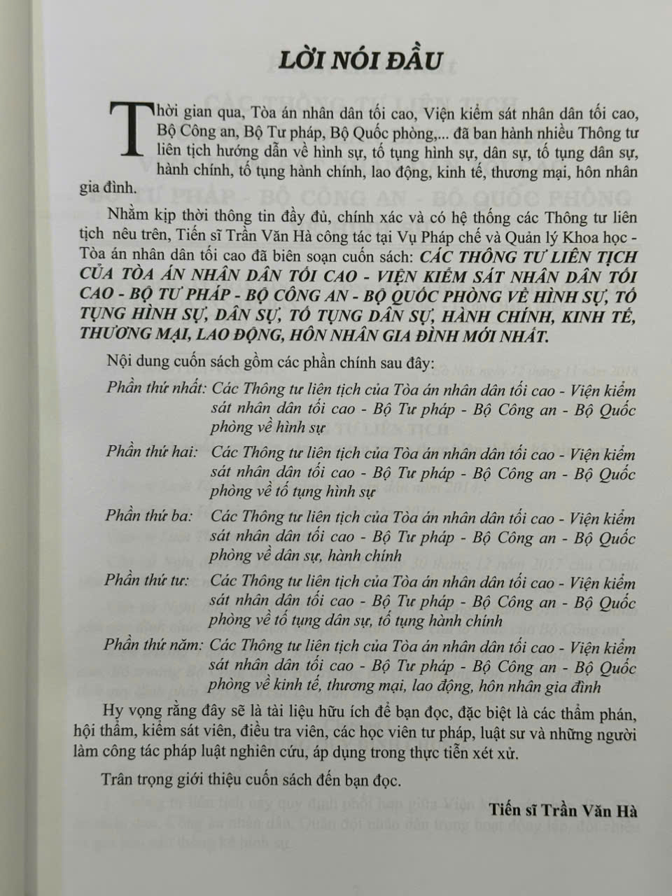 Nhằm kịp thời thông tin đầy đủ, chính xác và có hệ thống các Thông tư liên tịch nêu trên, Tiến sĩ Trần Văn Hà công tác tại Vụ Pháp chế và Quản lý Khoa học – Tòa án nhân dân tối cao đã biên soạn cuốn sách: Các Thông Tư Liên Tịch Của Tòa Án Nhân Dân Tối Cao, Viện Kiểm Sát Nhân Dân Tối Cao, Bộ Tư Pháp, Bộ Công An, Bộ Quốc Phòng Về Hình Sự, Tố Tụng Hình Sự, Dân Sự, TTDS, Hành Chính, Kinh Tế, Thương Mại, Lao Động, Hôn Nhân Gia Đình Mới Nhất