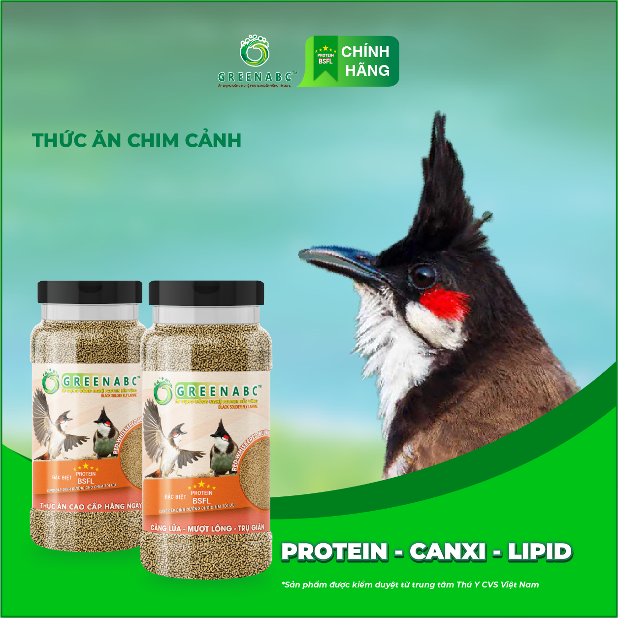 GREENABC - THỨC ĂN CHIM CHÀO MÀO GREENABC là thức ăn cao cấp dành cho CHIM CHÀO MÀO. Đặc biệt sản phẩm GREENABC được sản xuất theo phương pháp Áp dụng công nghệ PROTEIN bền