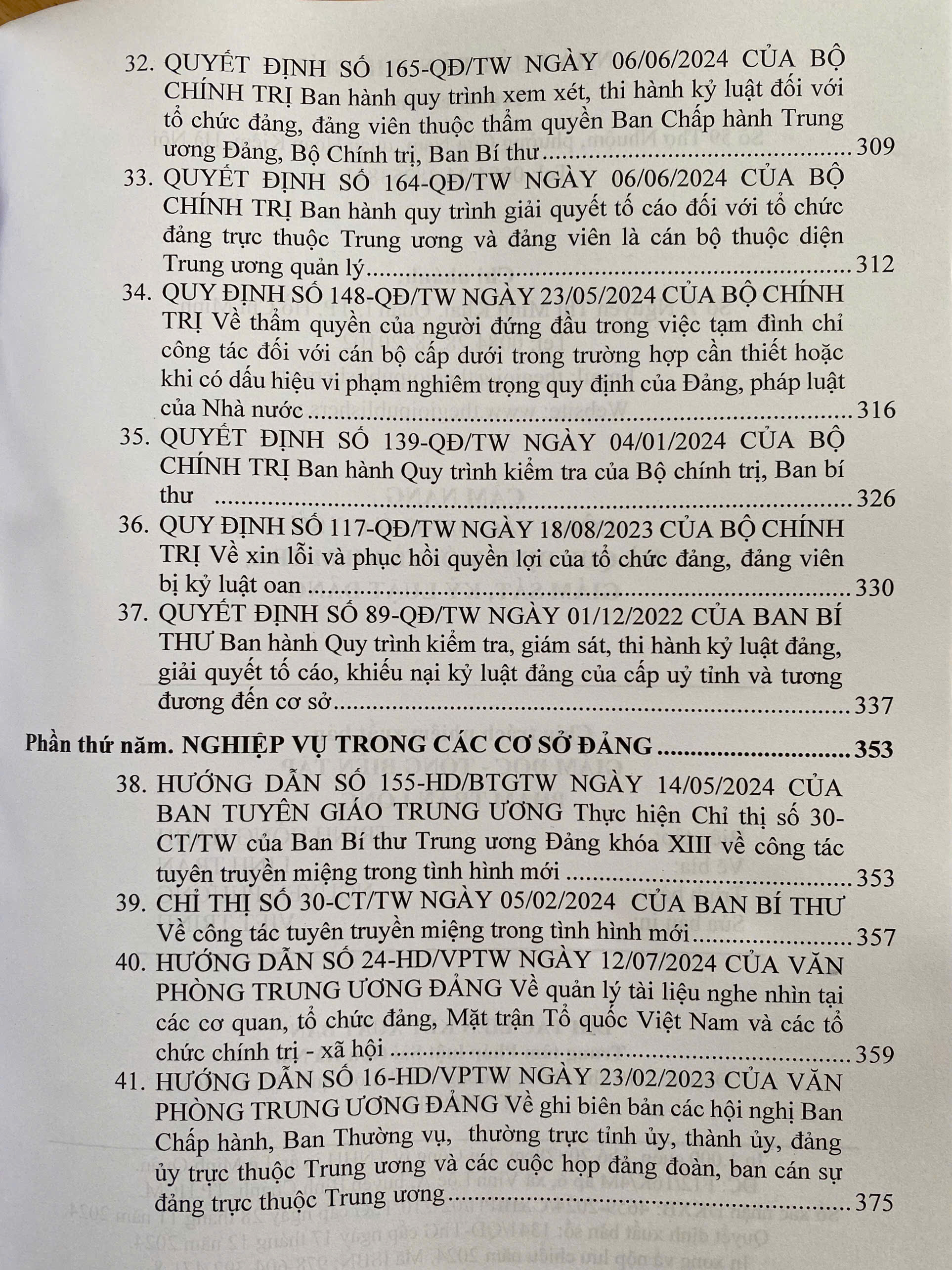 Nhận thức được tầm quan trọng cũng như tính cấp thiết của nhiệm vụ nâng cao năng lực lãnh đạo của Đảng nhằm đáp ứng yêu cầu của sự nghiệp đổi mới đất nước, thời gian qua, nhiều quy đ. ịnh, hướng dẫn của Ban Bí thư, Ban Chấp hành Trung ương, Ban Tuyên giáo Trung ương đã được ban hành như: Quyết định số 139-QĐ/TW ngày 04/01/2024 Ban hành Quy trình kiểm tra của Bộ chính trị, Ban bí thư; Quyết định số 165-QĐ/TW ngày 06/06/2024 Ban hành quy trình xem xét, thi hành kỷ luật đối với tổ chức đảng, đảng viên thuộc thẩm quyền Ban Chấp hành Trung ương Đảng, Bộ Chính trị, Ban Bí thư; Quy đ. ịnh số 183-QĐ/TW ngày 18/09/2024 Về bảo vệ cơ quan, tổ chức, người thi hành công vụ trong hoạt động điều tra, truy tố, xét xử, thi hành án...