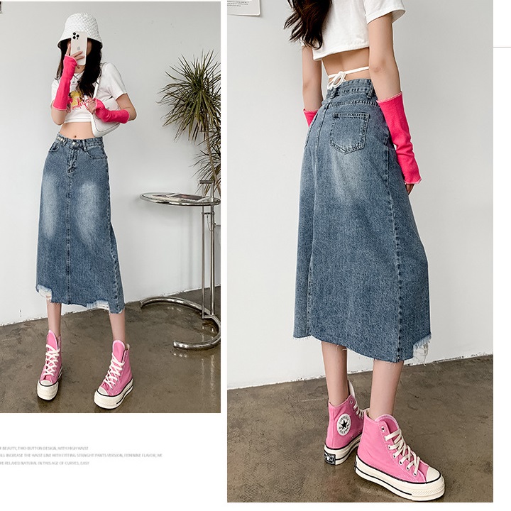 [CAO CẤP] Chân váy jean qua gối rách lai C065 dáng suông wax xanh xám không co dãn