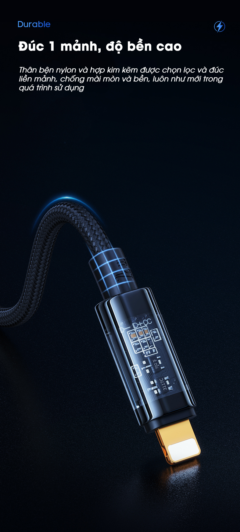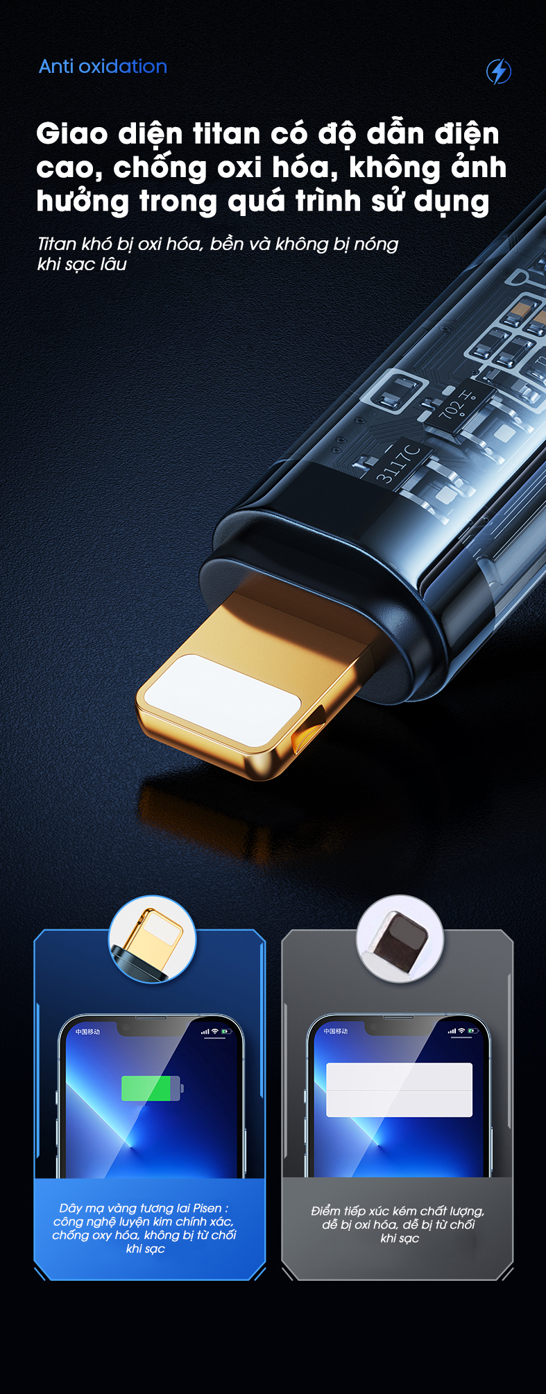 Các đầu tiếp xúc dây cắm được mạ vàng : Công nghệ luyện kim chính xác, chống oxy hóa, bền bỉ hơn, sạc công suất cao hơn, tự động nâng cấp theo phần phiên bản IOS tương thích trọn đời.