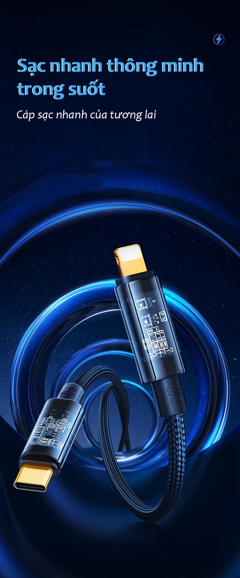 Thiết kế tối giản với độ dài 1.2m tương thích nhiều thiết bị, có thể đáp ứng hầu hết những nhu cầu sử dụng hàng ngày Công suất tối đa 30W với màn hình hiển