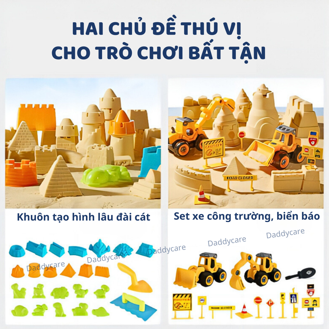 - Bộ sản phẩm: Cát x2 túi (mỗi túi 1kg), Hộp cát x1, Xẻng x1, Bay x1, Khuôn động vật x10, Khuôn xây dựng nhỏ x6, Khuôn xây dựng lớn x7 LƯU Ý: