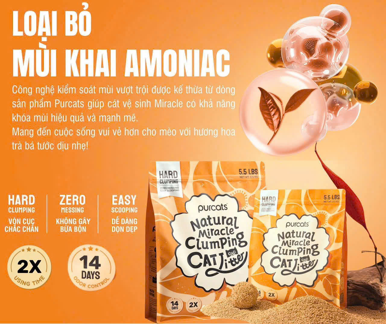 Công nghệ kiểm soát mùi vượt trội được kế thừa từ dòng sản phẩm Purcats giúp cát vệ sinh Miracle có khả năng khóa mùi hiệu quả và mạnh mẽ.