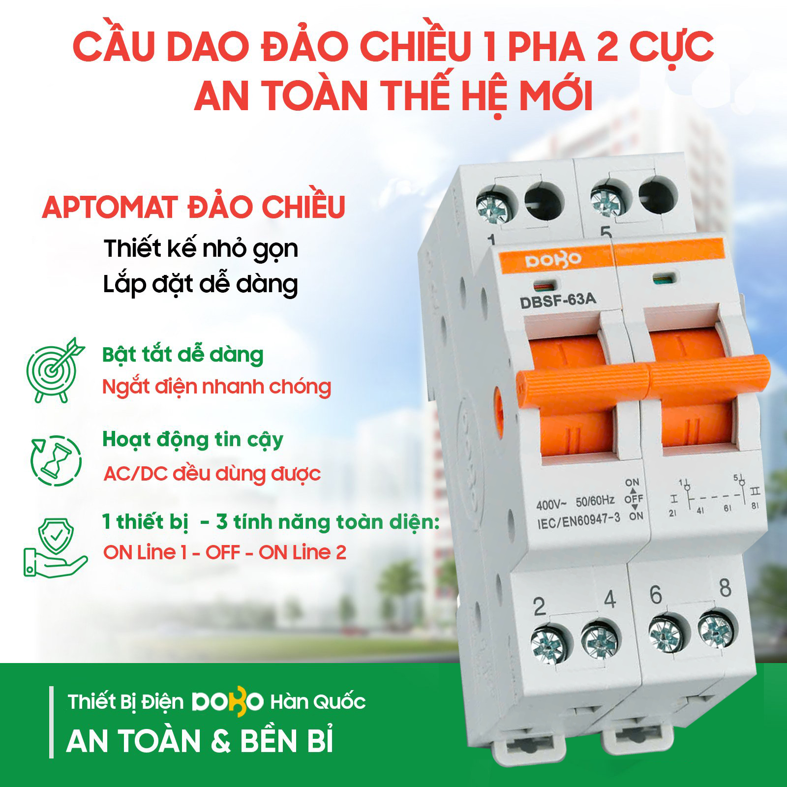 CB đảo chiều 2P 63A là: sản phẩm cầu dao đảo chiều dạng Aptomat công suất 2P 63A thương hiệu DoBo: