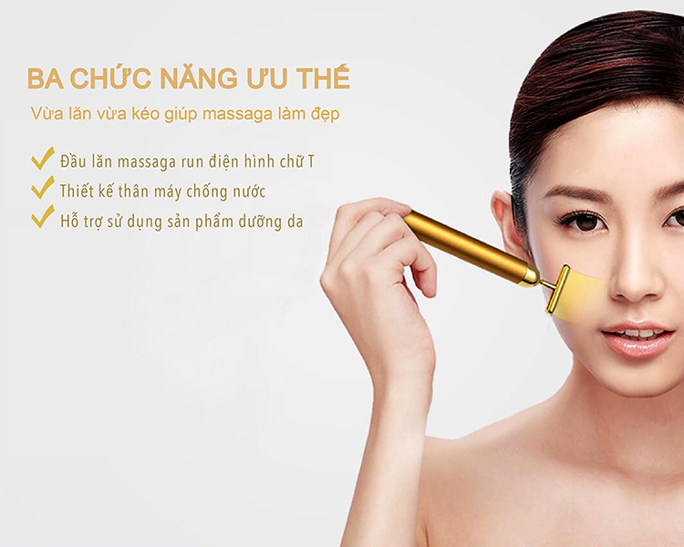 Cây lăn massage mặt Energy Beauty Bar với công dụng thúc đẩy sự tuần hoàn máu mặt và trao đổi chất giúp cải thiện hiện tượng natri tự nhiên, chẳng hạn như da nhão, nếp nhăn, nổi cộm gân, dưới mắt sưng phồng vì tuổi tác - Được ưa chuộng tại thị trường Nhật Bản , Hàn Quốc và Châu Âu - Mạ vàng và được chế tác bằng đồng - Chống lão hóa, chống nhăn Chức năng: 1. Thúc đẩy sự hấp thụ hiệu quả của Maquillage và quét sạch các tiết tố keratin 2. Ngân sự lão hóa và tăng cường khả năng miễn dịch. 3. Thúc đẩy sự tuần hoàn máu mặt và trao đổi chất nên chùng và cải thiện hiện tượng natri tự nhiên, chẳng hạn như da nhão, nếp nhăn, giật gân, dưới mắt sưng phồng và ghép dưới cằm vì tuổi tác. Đặc điểm: 1. Thuận tiện để sử dụng 2. Không cần phải cắm điện , chạy bằng pin AA 3. Sử dụng nó bất cứ lúc nào và bất cứ nơi nào. 4. Bạn có thể sử dụng một cách dễ dàng trong khi thưởng thức truyền hình và âm nhạc và khi đang tắm . * Hướng dẫn sử dụng : - Lăn khắp mặt , vùng cổ , vùng mắt , vùng trắn , vùng khỏe miệng bằng động tác di chuyển lên xuống , chú ý tập trung vào các khu vực có nếp nhăn hay vết chân chim. - Có thể mát xa không, hoặc dùng kèm kem dưỡng để tăng cao hiệu quả. Lăn khắp mặt, vùng cổ, vùng mắt, vùng tráằng động tác di chuyển lên xuống. - Sử dụng 2-3 lần một ngày , mỗi lần trong vòng 3-5 phút