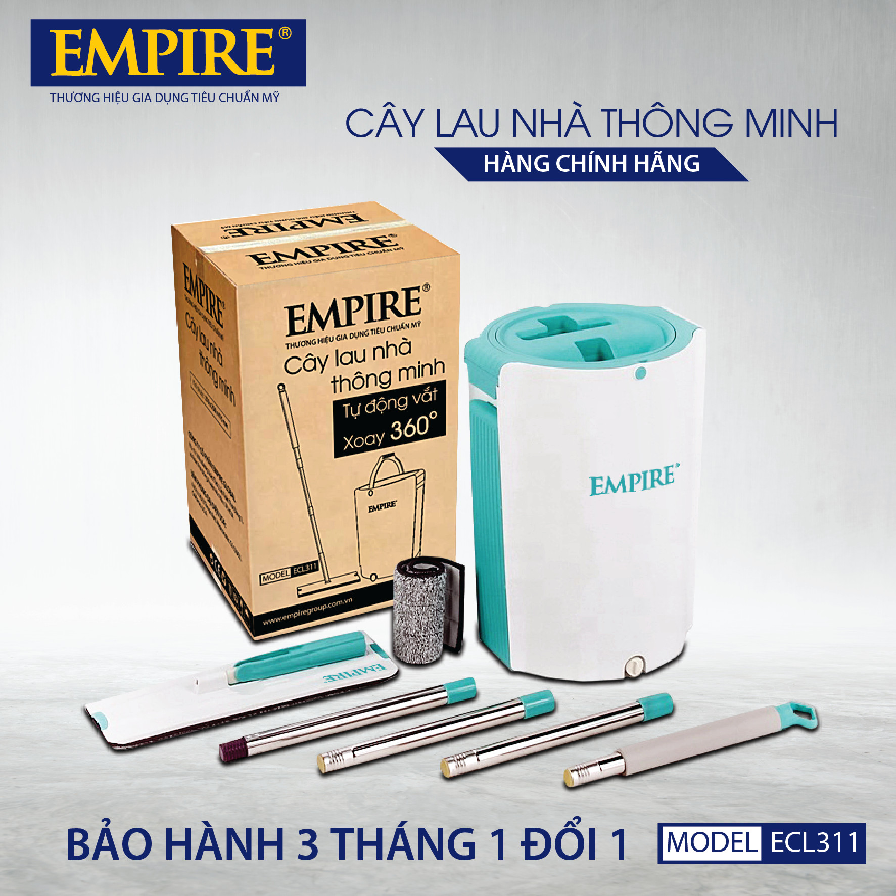 CÂY LAU NHÀ EMPIRE ECL311 Bộ Lau Nhà Tự Vắt Thông Minh với khả năng lau sạch sàn nhà một cách nhanh chóng và nhẹ nhàng, phù hợp với mọi loại bề mặt sàn như sàn gạch, sàn gỗ, sàn đá, tường ốp gạch và mặt kính, phù hợp với mọi không gian và diện tích nhà ở.